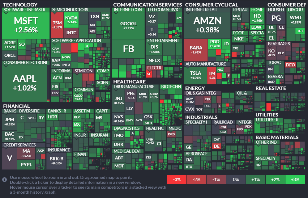 기술주 중심의 상승세가 두드러졌다. 주요 기술주인 팡(FAANG) 종목은 모두 올랐다. 아마존이 2.06% 가장 큰 폭의 상승률을 기록했고 페이스북, 애플, 넷플릭스 모두 1%대 강세를 보였다. 특히 구글은 1.90% 오르며 장중 신고가를 경신했다.