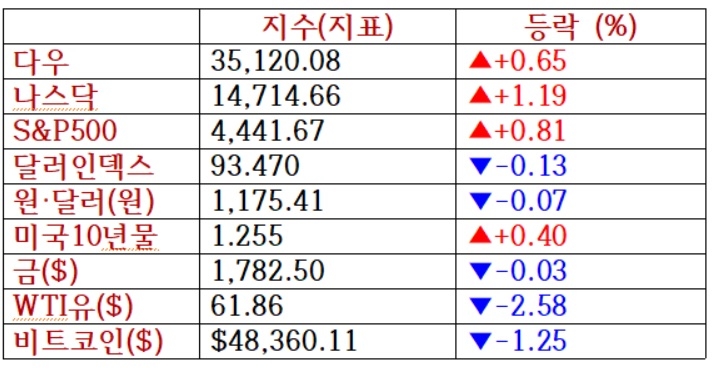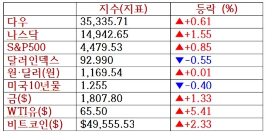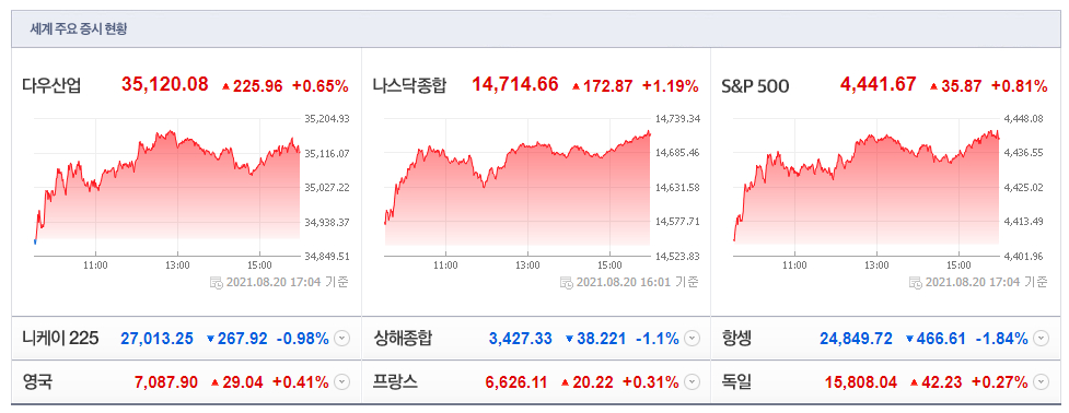 현지시간 23일 뉴욕증시는 이번 주 예정된 잭슨홀 심포지엄을 앞두고 화이자의 신종 코로나바이러스 감염증(코로나19) 백신의 정식 승인 소식 등에 상승 마감했다. 다우 지수는 전 거래일보다 0.61% 상승한 35,335.71에 거래를 마쳤다. S&P500지수는 0.85% 오른 4,479.53을, 기술주 중심의 나스닥 지수는 1.55% 뛴 14,942.65에 장을 마감했다. S&P500은 장중 사상 최고치를 찍었지만 마감가 기준으로는 이전 최고치 벽을 넘지 못했다. 나스닥은 사상 최고치로 마감했다.