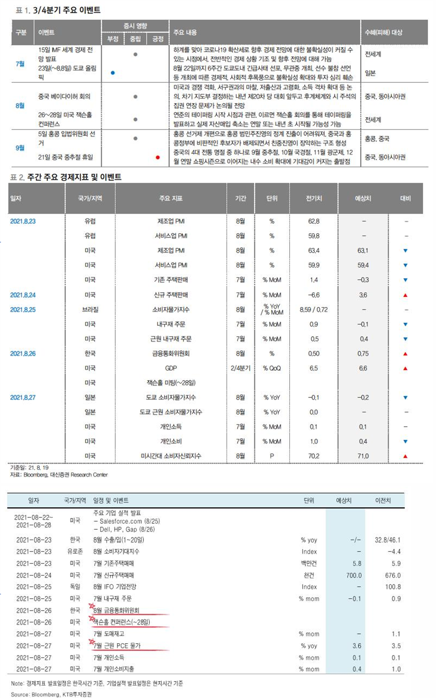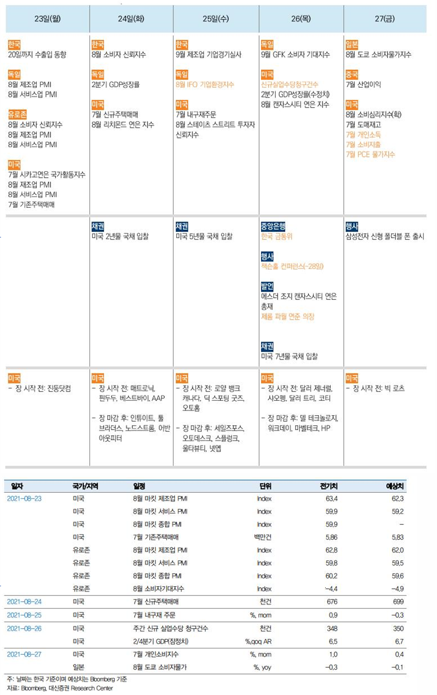 특히 시장은 오는 26일부터 열리는 잭슨홀 심포지엄에 관심이 쏠려있다. 연준이 지난주 공개한 7월 연방공개시장위원회(FOMC) 회의록에서 대부분 위원은 연내 테이퍼링을 시작하는 것이 적절할 수 있다고 언급해 테이퍼링 시기가 예상보다 빨라질 수 있음을 시사했다. 연준이 팬데믹 동안 시행한 자산 매입 프로그램의 단계적 축소는 주식시장에 긴축의 신호탄으로 해석될 수 있지만, 그만큼 미국 경제가 회복했음을 보여주는 신호라는 점에서 충격은 제한적일 수 있다. 다만 코로나19에 대한 우려가 커지는 가운데 부양책 축소가 경기 회복세를 둔화시킬지, 또 그에 따라 주가가 타격을 입을지는 좀 더 두고 봐야 할 것으로 예상된다.