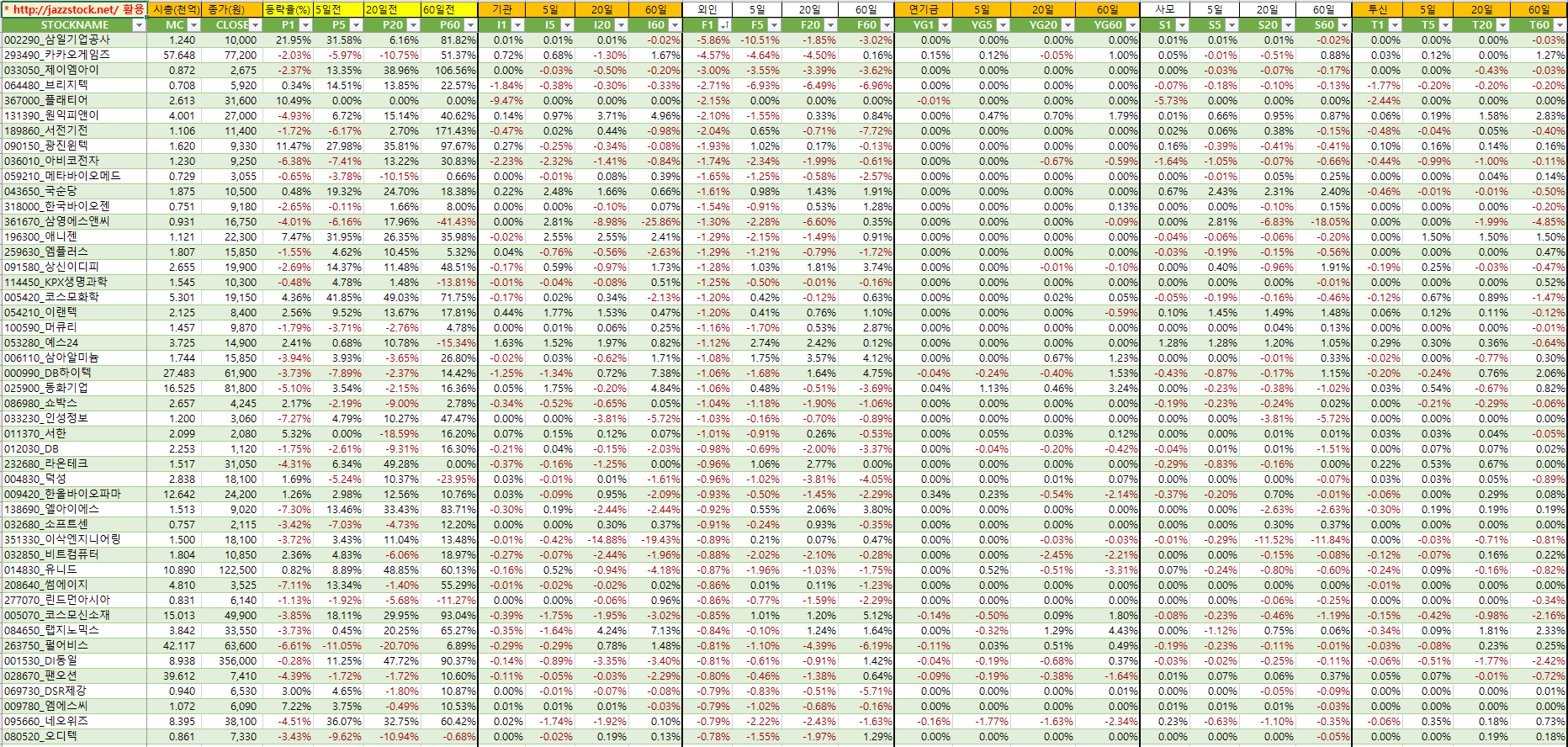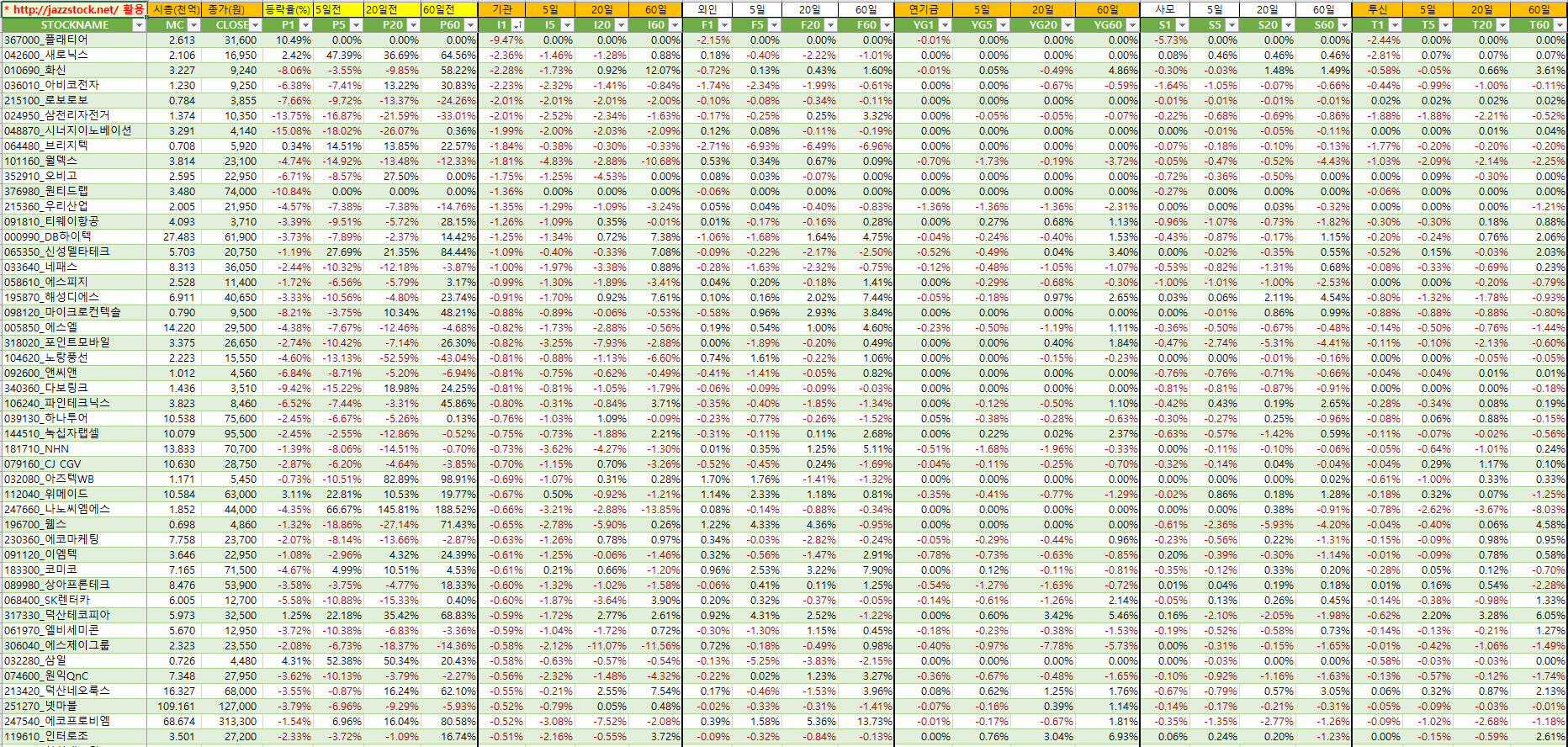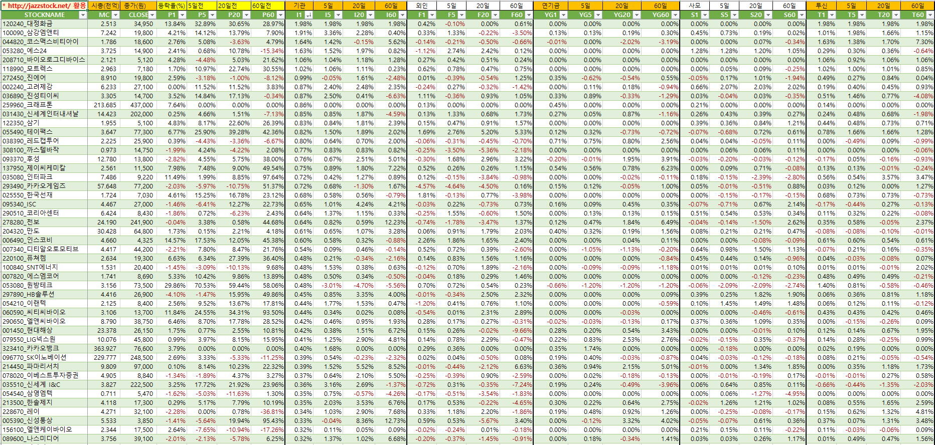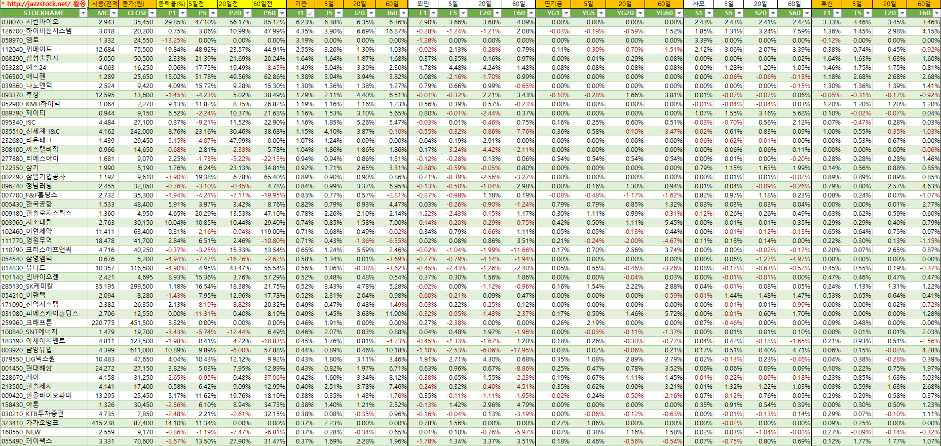 | 분류 | 티커 | 현재가 | 등락률 | t신호 | 수익률 | ||