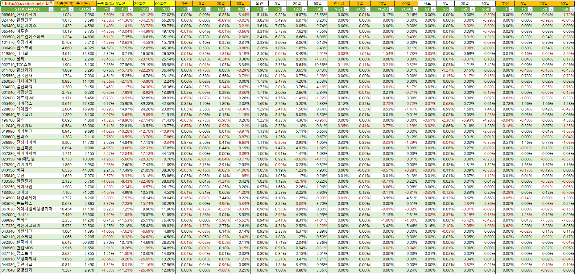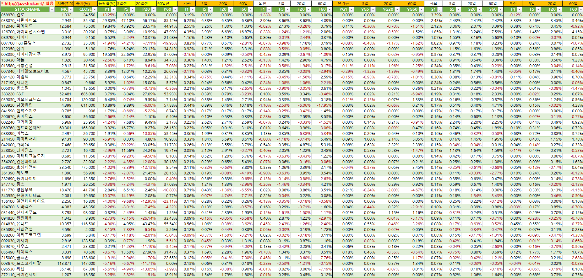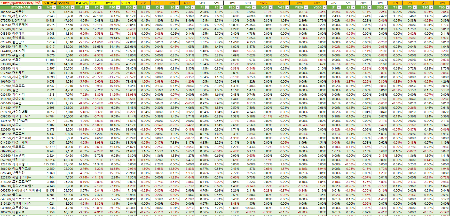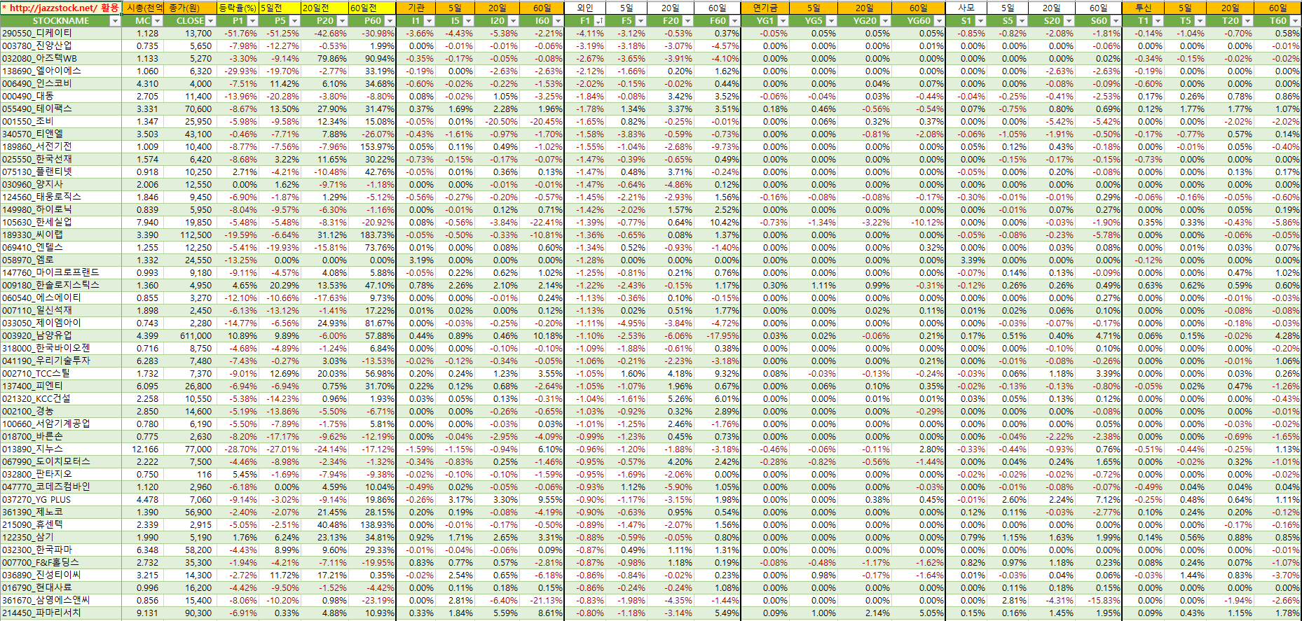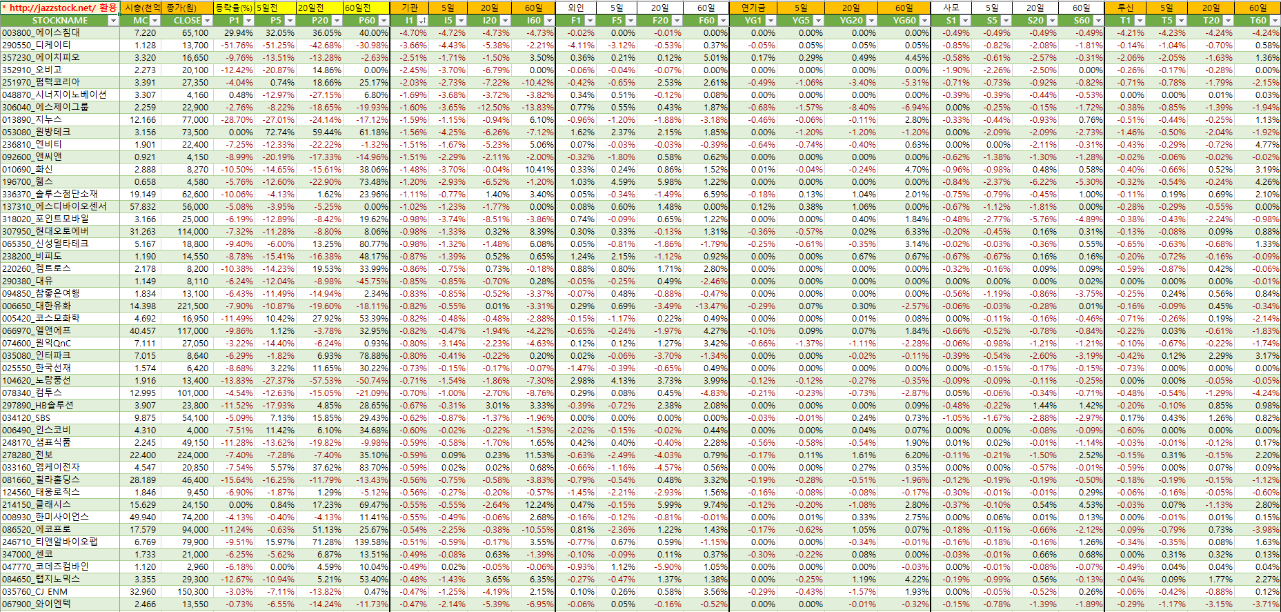 | 분류 | 티커 | 현재가 | 등락률 | t신호 | 수익률 | ||