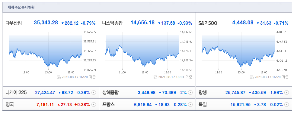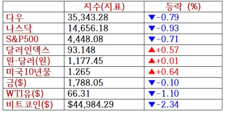 다우 지수는 전 거래일보다 0.79% 하락한 35,343.28에 거래를 마쳤다. S&P500지수는 0.71% 내린 4,448.08을, 기술주 중심의 나스닥 지수는 0.93% 밀린 14,656.18로 장을 마감했다. 다우지수와 S&P500지수는 전일까지 사상 최고치를 연달아 경신했지만, 이날은 3대 주요 지수 모두 내렸다.