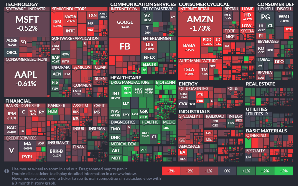 주요 기술주인 팡(FAANG) 종목은 넷플릭스(+0.19%)를 제외하고 모두 약세를 보였다. 페이스북이 2.21% 가장 큰 폭의 하락률을 기록했고 아마존과 구글은 모두 1%대 약세를 나타냈다. 애플은 0.62% 약보합권에서 거래를 마쳤다.