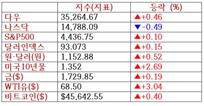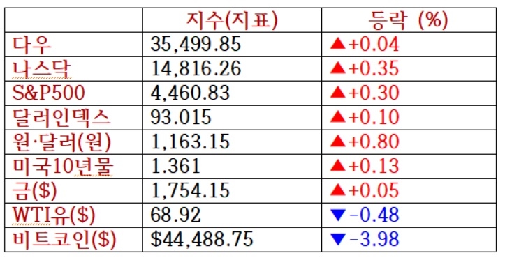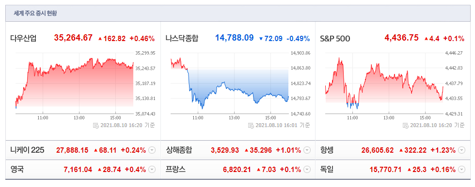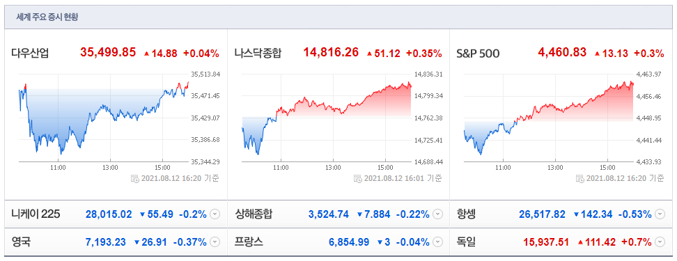 현지시간 12일 뉴욕증시는 투자자들이 인플레이션 위험과 신종 코로나바이러스 감염증(코로나19) 델타 변이의 확산을 주시한 가운데 개선된 고용지표에 투자심리가 확산되며 일제히 상승 마감했다. 다우 지수는 전 거래일보다 0.04% 상승한 3만5499.35로 거래를 마쳤다. S&P500지수는 0.30% 오른 4460.83을, 기술주 중심의 나스닥 지수는 0.35% 뛴 1만4816.26으로 장을 마감했다. 다우지수와 S&P500지수는 3거래일 연속 최고치 행진을 이어갔다.