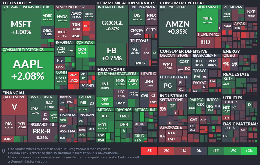 주요 기술주인 팡(FAANG) 종목은 넷플릭스(-0.33%)를 제외하고 모두 강세를 나타냈다. 최근 주춤하던 기술주에 매수세가 유입하면서 상승 반전했다. 애플이 2.08% 가장 큰 폭의 상승률을 기록했고 페이스북과 아마존, 구글은 약보합권에서 거래를 마쳤다.