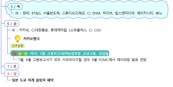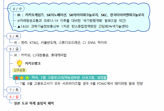☑️사실 7월한달간 발표된 대부분의 고용데이타는 모두 기대이하입니다. 금요일 발표될 7월 고용보고서도 좋을 가능성은 낮아보입니다. 이제 쇼크걱정을 해야할 것 같습니다. 적당한게 안좋은 레벨이 증시에겐 최선입니다. 9월부터 모든 정부 현금지원 부양책(실업급여 보너스)은 끝납니다.