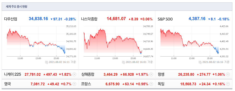 현지시간 2일 뉴욕증시는 제조업 지표가 엇갈리고, 장 마감 긴축 우려가 떠오르면서 혼조세로 마감했다. 다우 지수는 전 거래일보다 0.28% 하락한 34,838.16으로 거래를 마쳤다. S&P500지수는 0.18% 떨어진 4,387.16을, 기술주 중심의 나스닥 지수는 0.06% 오른 14,681.07로 장을 마감했다.