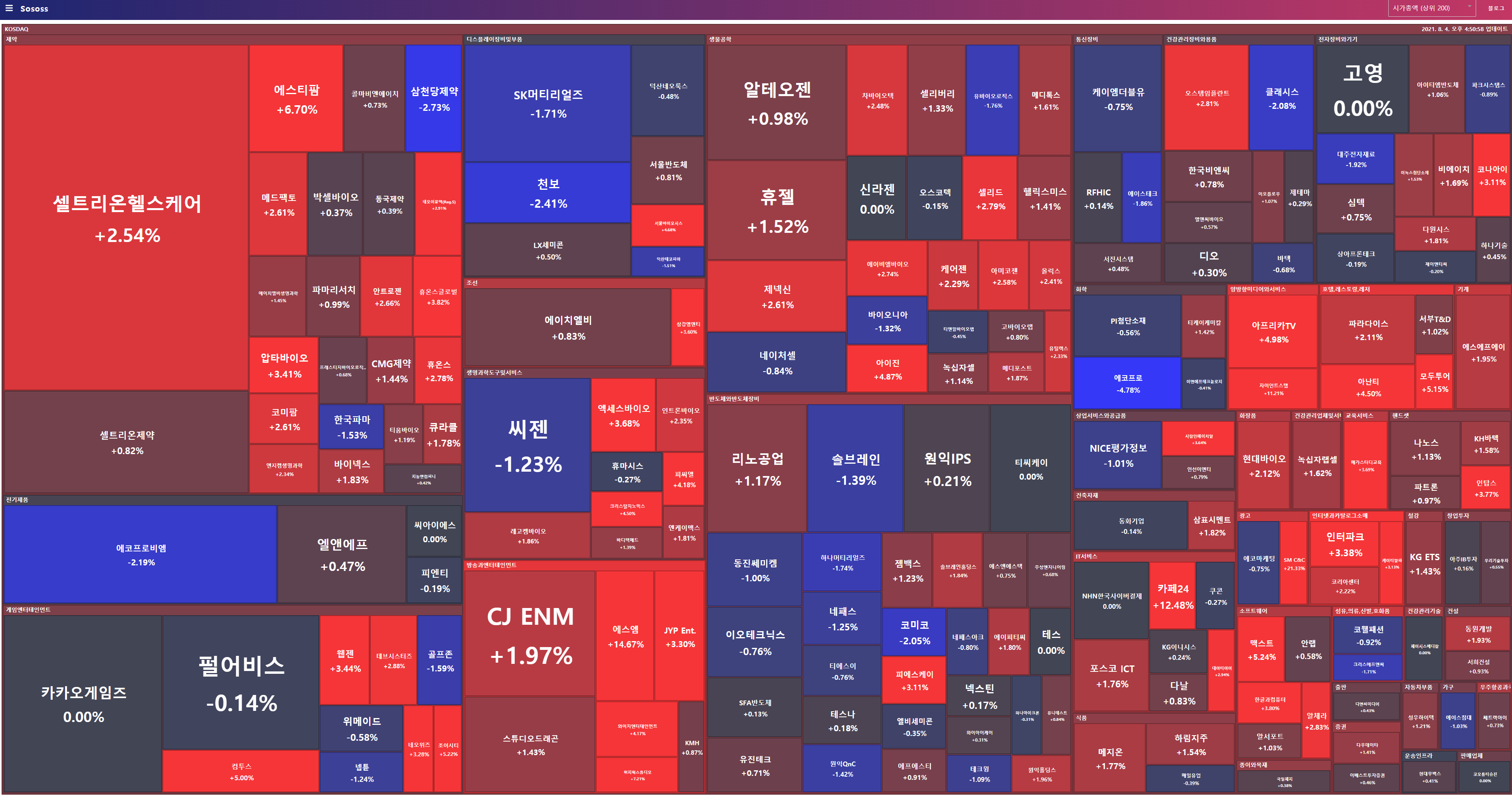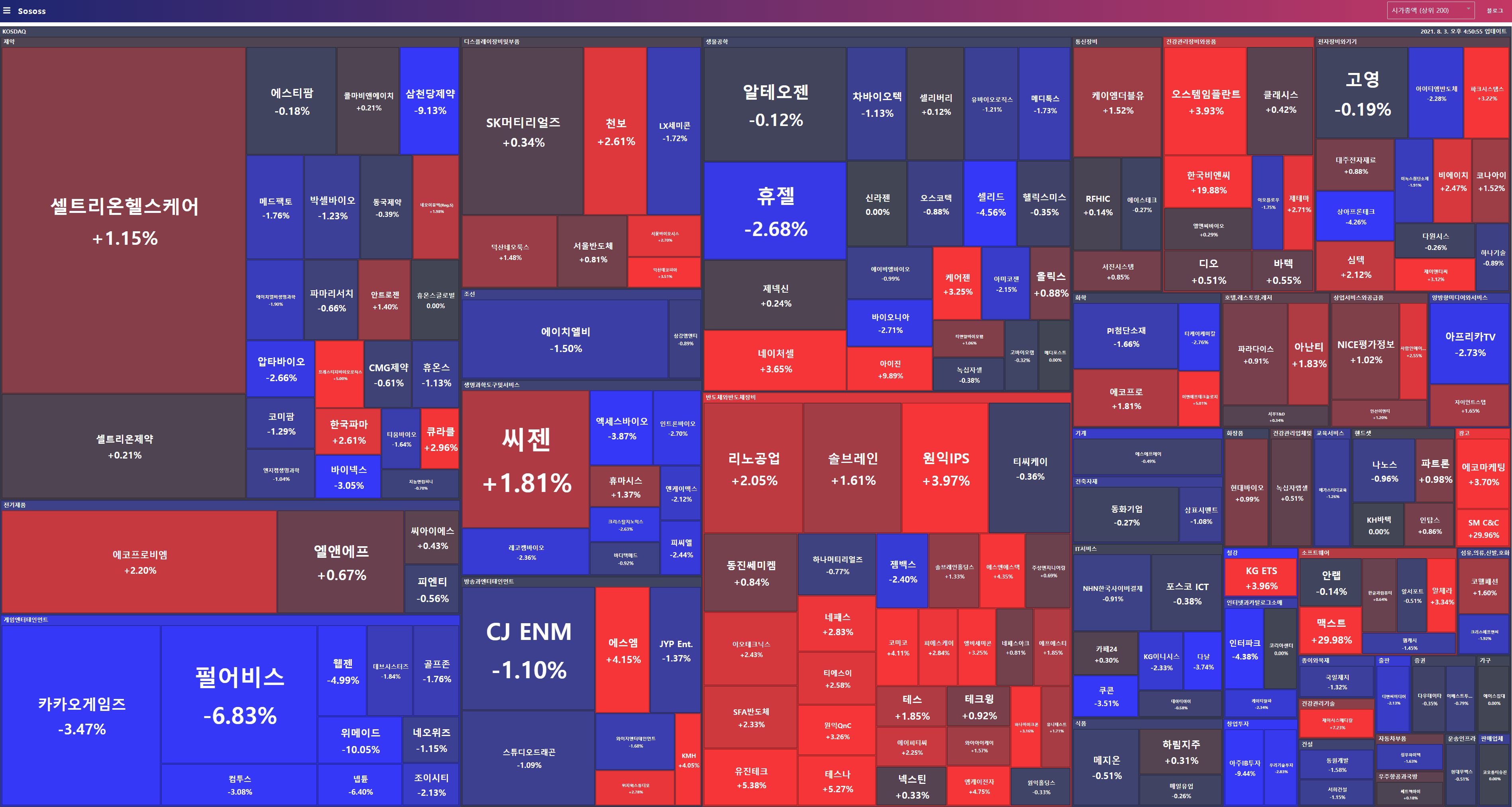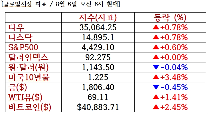 특히 S&P500지수는 마감가 기준으로 사상 최고치를 경신했다. 미국의 코로나19 델타 변이는 장 초반 주가에 하락 압력을 가했으나 기업들의 실적 기대가 유지되면서 오후 들어 주가는 상승세로 전환했다.
