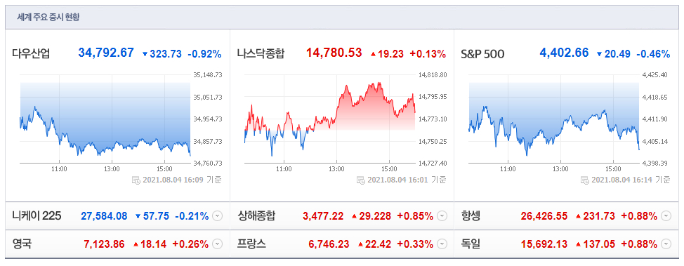 현지시간 4일 뉴욕증시는 민간 고용이 부진하게 나온 가운데 지수별로 엇갈린 모습을 보였다.뉴욕증권거래소에서 다우존스30 산업평균지수는 전장보다 0.92% 하락한 34,792.67로 장을 마쳤다. S&P500지수는 전장보다 0.46% 떨어진 4,402.68을 나타냈고, 기술주 중심의 나스닥지수는 전장보다 0.13% 오른 14,780.53으로 거래를 마감했다. 전날 S&P500지수는 마감가 기준 사상 최고치를 경신했으나 이날 고점을 높이지는 못했다.