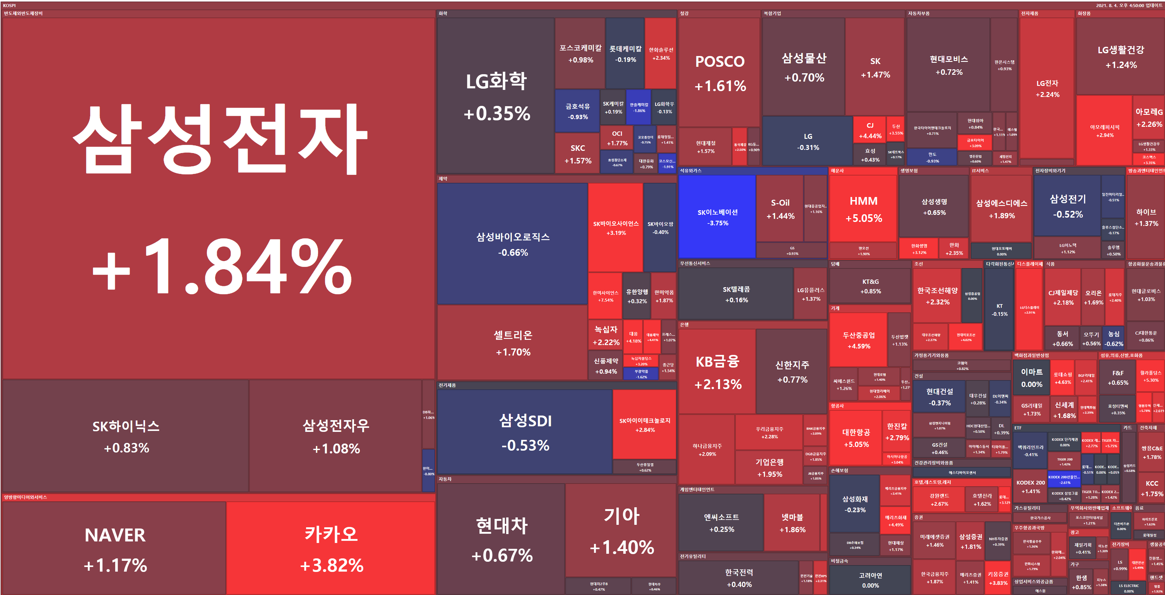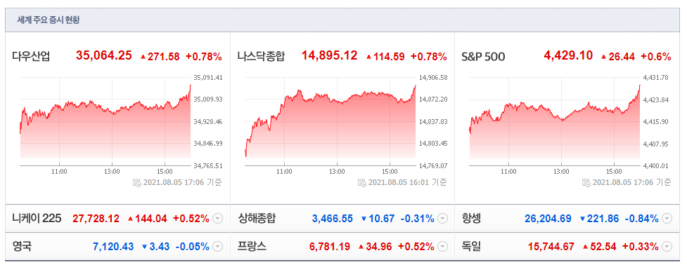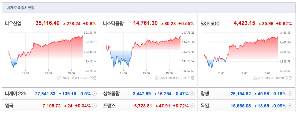현지시간 3일 뉴욕증시는 델타 변이에 대한 우려에도 기업들의 2분기 실적이 대체로 상승했다. 다우 지수는 전 거래일보다 0.80% 상승한 3만5116.40으로 거래를 마감했다. S&P500지수도 전장보다 0.82% 오른 4423.15를 기록했고, 기술주 중심의 나스닥지수 역시 0.55% 뛴 1만4761.29로 장을 마쳤다.