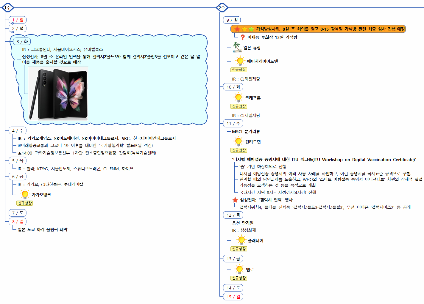 외국인의 지속적인 매수가 중요합니다. 경영권 안정성문제가 해결될 가능성이 높아진 삼성전자를 중심으로 기대해봅니다. 개인유동성은 코스닥 중심으로 유입될 가능성이 커졌습니다. 내년상반기에 대선이 있습니다. 금통위가 대선을 앞두고 신규확진자가 1000명이 넘는 상황에서 금리인상을 할 가능성도 낮습니다. 옐런처럼 엄포만 가능한 상황입니다. 여러모로 국내증시는 미국시장이 가는 상황에서 개인투자자의 유동성과 외국인 유동성이 콜로보를 이룰 경우 생각보다 아름다운 섬머랠리를 만들 수도 있습니다.