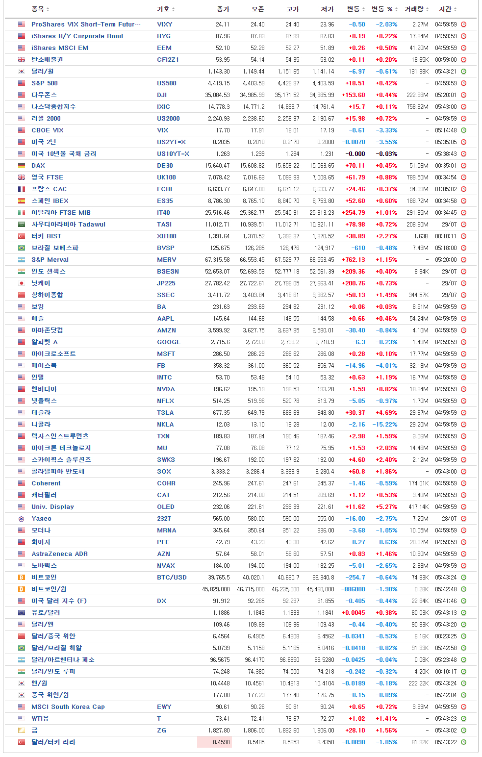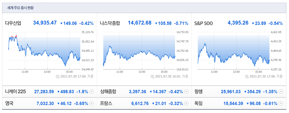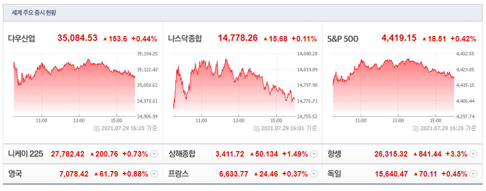 현지시간 29일 뉴욕증시는 미국의 2분기 국내총생산(GDP) 등 주요 경제 지표가 예상치를 하회했지만 모두 상승 마감했다. 다우 지수는 전 거래일보다 0.44% 오른 35,084.53으로 거래를 마쳤다. S&P500지수는 0.42% 상승한 4,419.15를, 기술주 중심의 나스닥 지수는 0.11% 뛴 14,778.26으로 장을 마감했다.