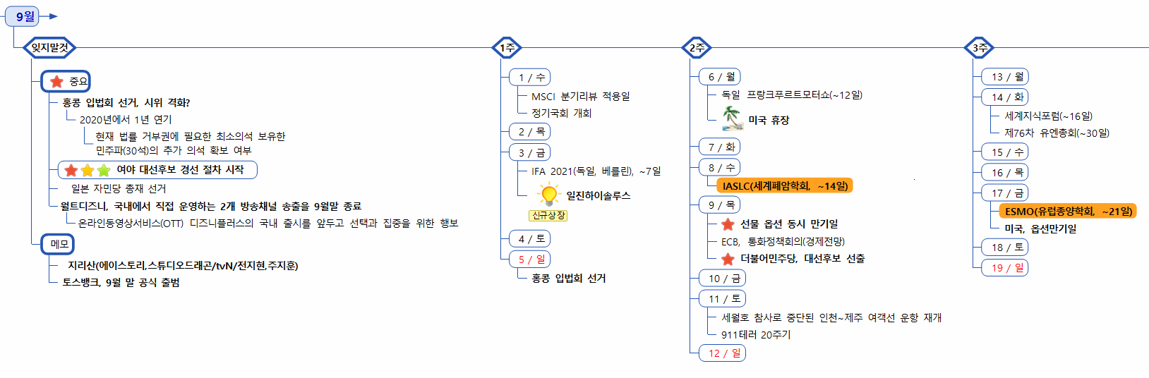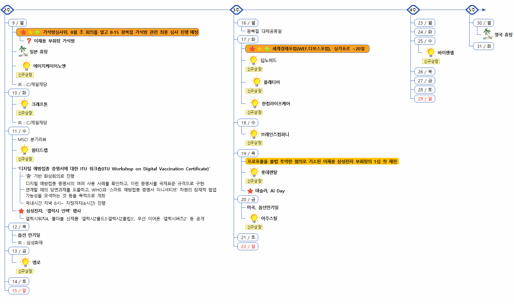 1) 증시캘린더는 개인적으로 관련된 소식을 확인후 작성한 일정이라 변동 또는 오류의 소지가 있습니다.