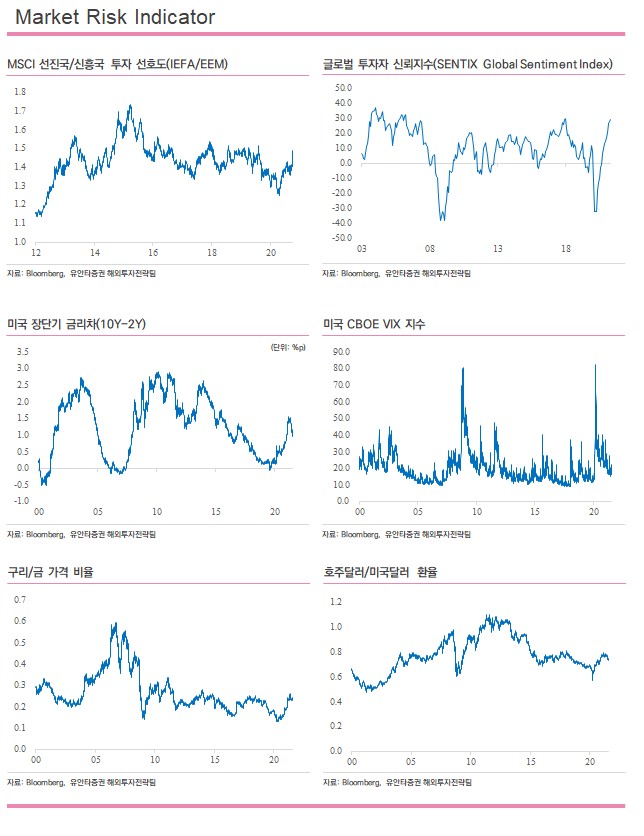 유럽증시는 견조한 경제지표와 실적 발표에 최고치 마감. 금일 발표된 유로존 7월 경기기대지수는 119 포인트를 기록해 예상치(118.2)를 웃돌았으며, 데이터를 집계한 1985년 이후 최고치 기록. 아울러 기업의 호실적 랠리가 증시 상승에 동력을 제공하며 범유럽지수인 STOXX600은 다시 한 번 종가 기준 최고치 경신. 금일 상승 업종으로는 에너지(+1.7%), 금융(+1.0%), 소재(+0.7%)가 오름세를 기록하였으며 부동산(-0.5%), 커뮤니케이션(-0.6%)은 약세로 마감. 에너지 업종에서는 프랑스의 토탈에너지(TTE/+2.2%)와 로열더치쉘(RDSA/+3.8%)이 유가 상승에 따른 마진 폭 확대로 주주 환원을 위한 자사주 매입을 발표하며 섹터 상승을 견인하였으며, 소재업에서는 앵글로 아메리칸(AAL/+5.4%)이 비철금속 상승에 호실적을 발표하며 41억 달러 규모의 배당금과 자사주 매입 계획을 발표하며 상승을 견인. 한편, 레피니티브 IBES 데이터에 따르면 현재까지 STOXX600 기업 중 41%가 실적을 발표하였으며, 그 중 67% 가 컨센서스를 상회한 실적을 발표한 것으로 집계됨.