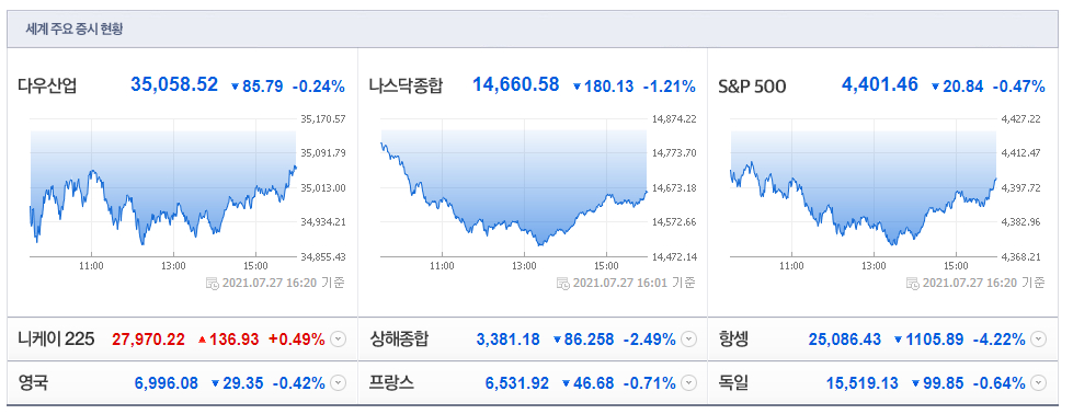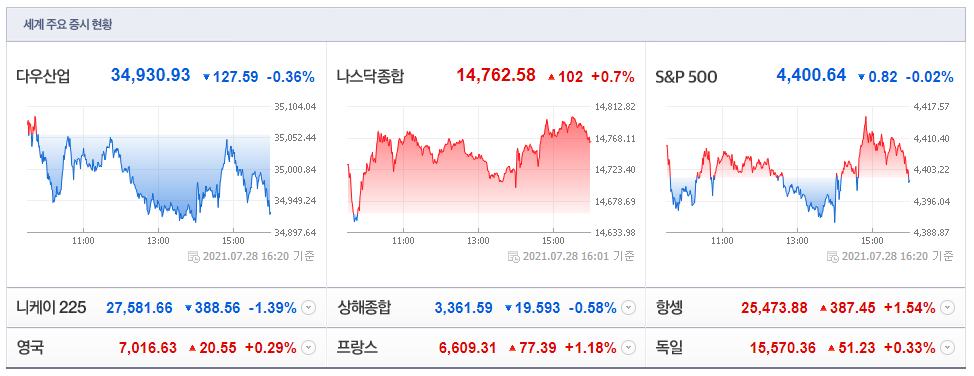 현지시간 28일 뉴욕증시는 대형 기술 기업들의 호실적에도 미 연방공개시장위원회(FOMC) 결과에 대한 해석이 엇갈리며 혼조세로 마감했다. 다우 지수는 전 거래일보다 0.36% 하락한 34,930.93으로 거래를 마쳤다. S&P500지수는 0.02% 떨어진 4,400.64를, 기술주 중심의 나스닥 지수는 0.70% 오른 14,762.58로 장을 마감했다.