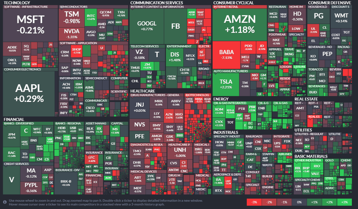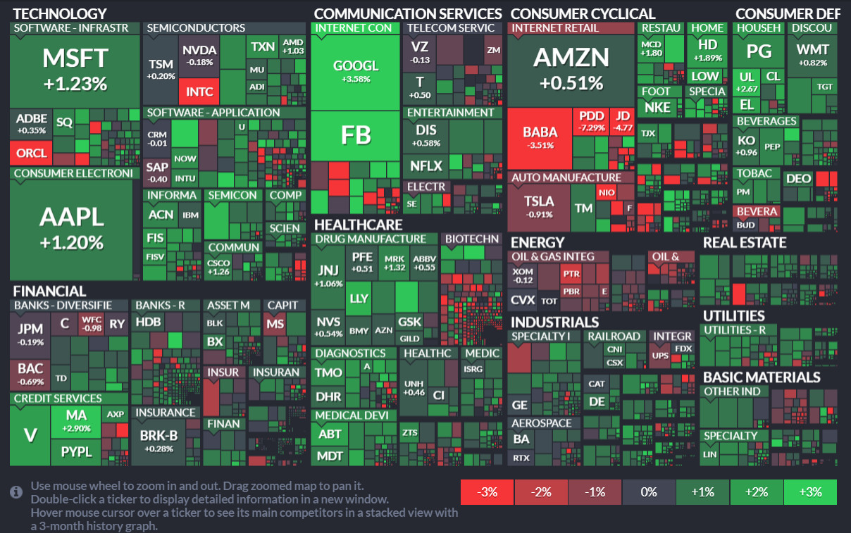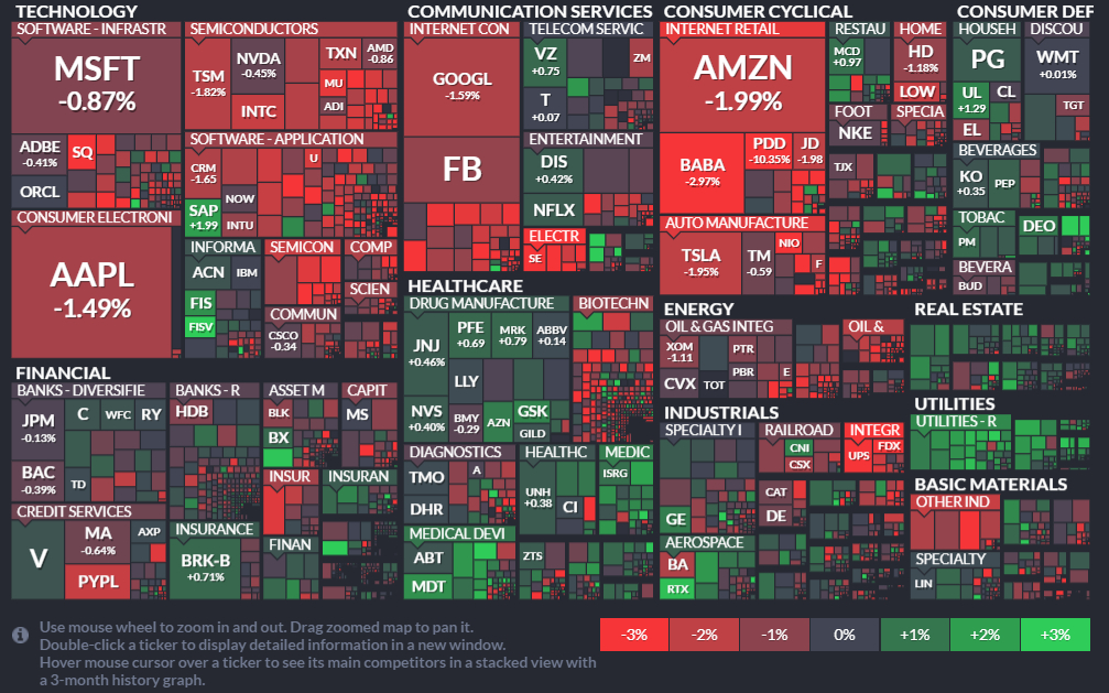 미국 증시는 대형 기술주의 실적을 주시하며 하락 마감. 금일 장 마감 후 마이크로소프트(MSFT/-0.9%), 애플(AAPL/-1.5%), 알파벳(GOOGL/-1.6%)의 실적 발표 예정. 다만, 증시 고점 부담에 차익매물이 출회되며 시장은 관망세를 유지하고 있으며, 중국 당국의 기업 규제에 따른 투자 심리 약화가 증시 하방 압력을 가중시킨 모습. 특히, 캐시우드의 ARK 인베스트먼트는 전일 징둥닷컴(JD/-2.0%), 텐센트(TCEHY/-2.1%), 알리바바(BABA/-3.0%)의 주식을 대규모 매도한 것으로 알려졌으며, 금일 미국에 상장된 중국 기업 전반이 약세를 시현하며 3대 지수 하락에 기여함. 금일 상승 업종으로는 기술주 중심의 매도세로 경기방어주로 자금이 유입되며 유틸리티, 부동산이 오름세를 기록하였으며, 반도체와 IT 섹터가 하락 마감. 한편, 이날부터 연방준비제도(Fed)의 연방공개시장위원회(FOMC) 정례회의가 시작되었으며, 시장은 제롬 파월 연준 의장이 테이퍼링에 대해 어떤 발언을 할지 주목하는 모습.