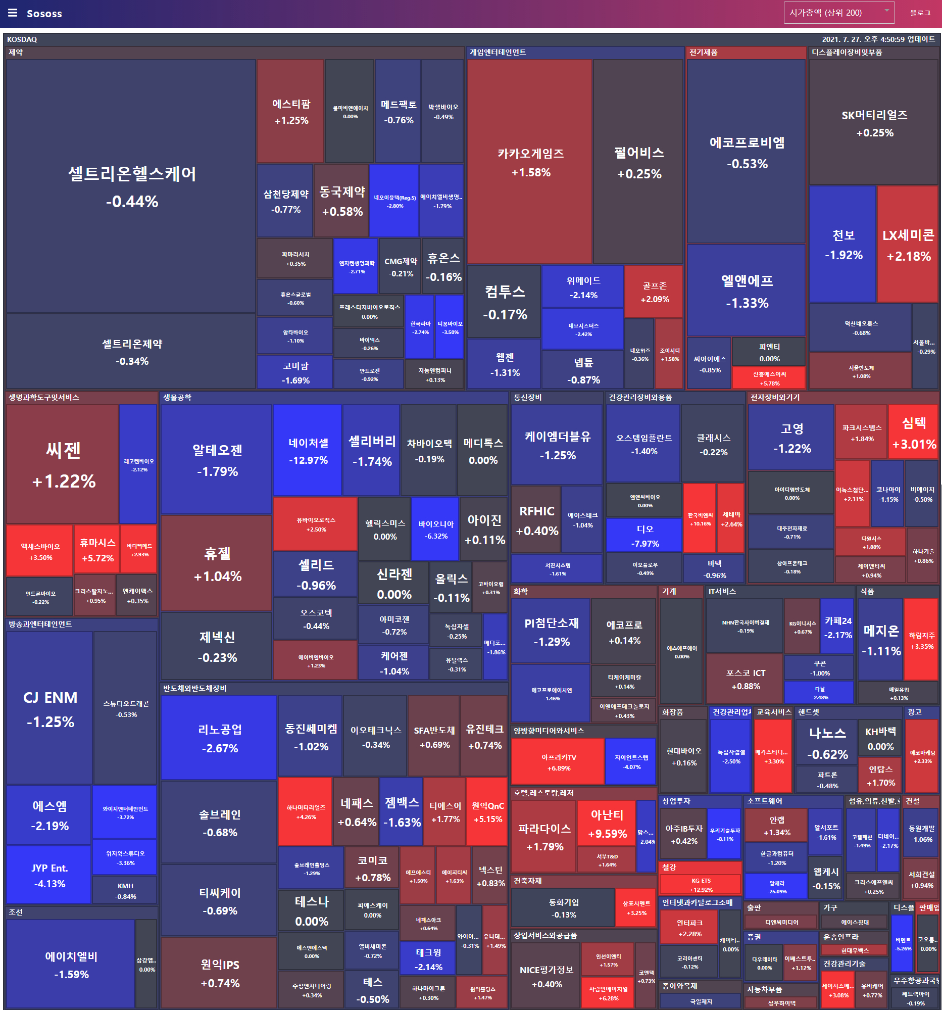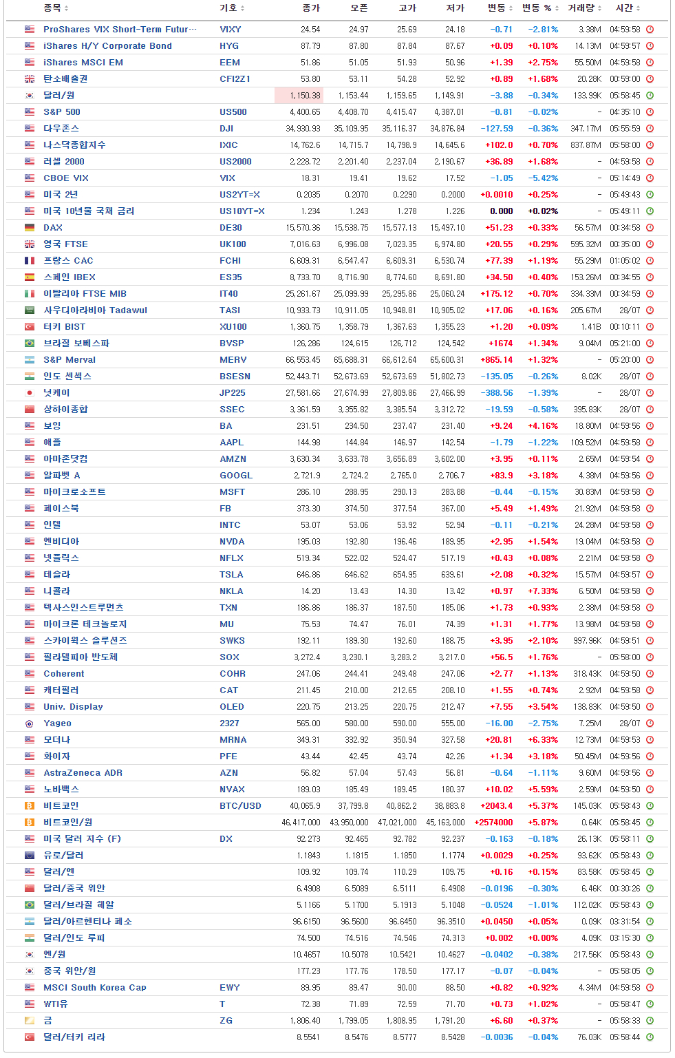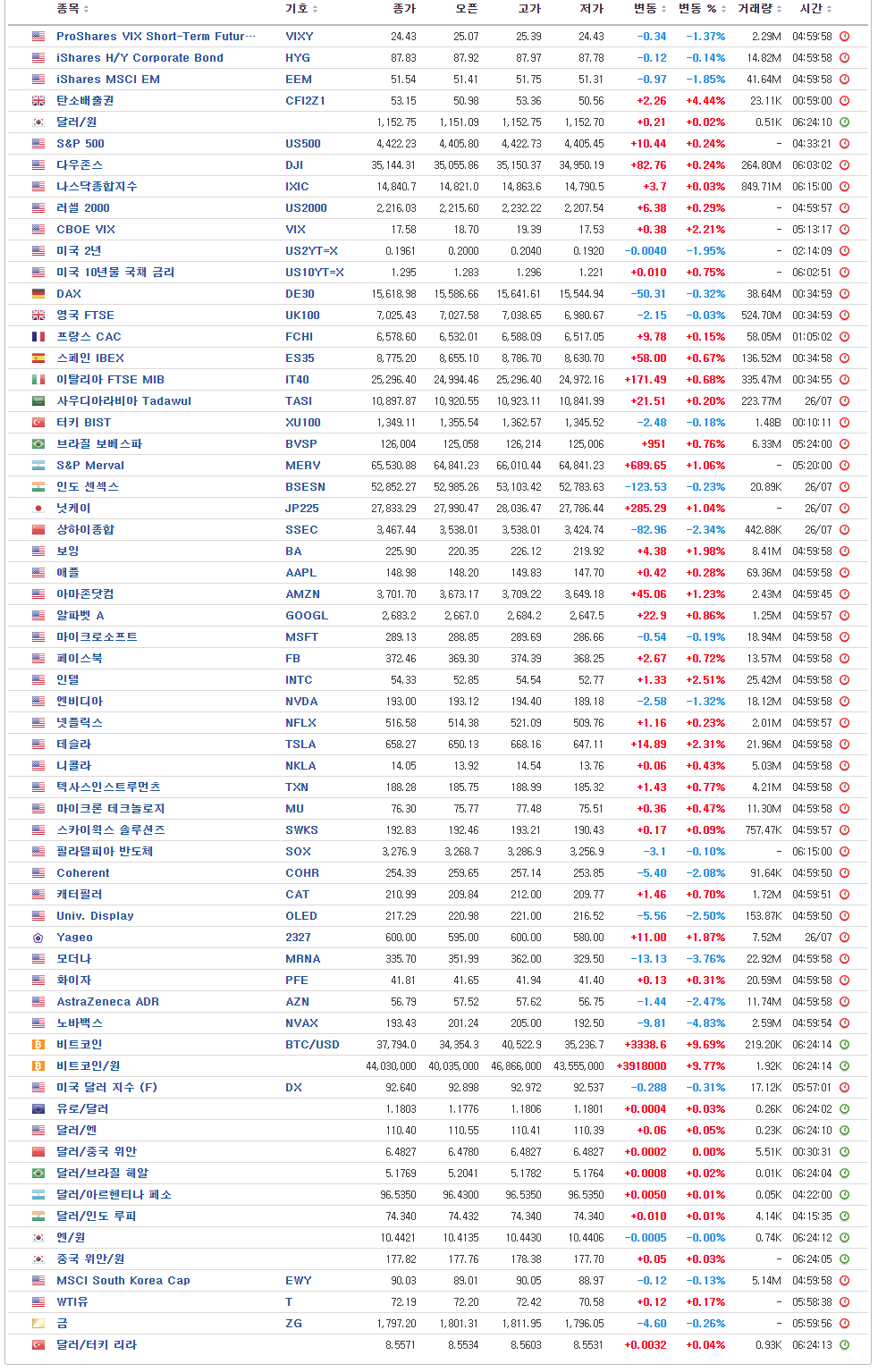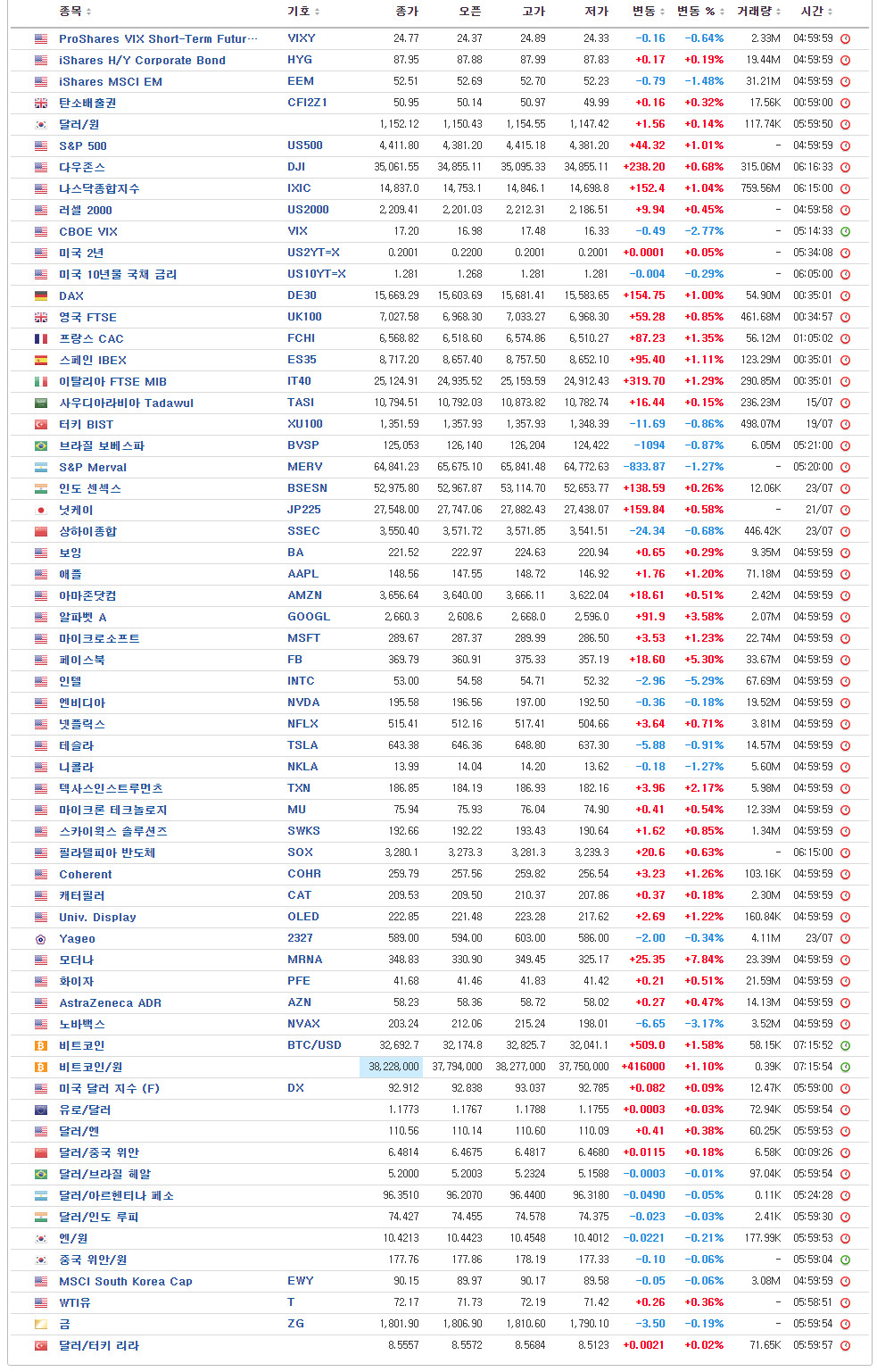 미 증시는 테슬라가 실적 발표 후 차익 실현 매물이 출회되며 하락하자 대형기술주는 물론 반도체 등 기술주가 하락 주도. 더불어 질병통제예방센터(CDC)가 백신 접종자도 실내에서 마스크 착용 지침을 발표 할 것이라는 소식도 투자 심리 위축 요인. 그러나 실적 시즌에 대한 기대심리는 여전해 장 후반 반발 매수세가 유입되며 낙폭이 축소. 특히 델타 변이 바이러스 여파로 연준이 예상보다 덜 매파적인 내용을 언급 할 것이라는 기대 심리도 반영되며 낙폭 축소 마감(다우 -0.24%, 나스닥 -1.21%, S&P500 -0.47%, 러셀2000 -1.13%)