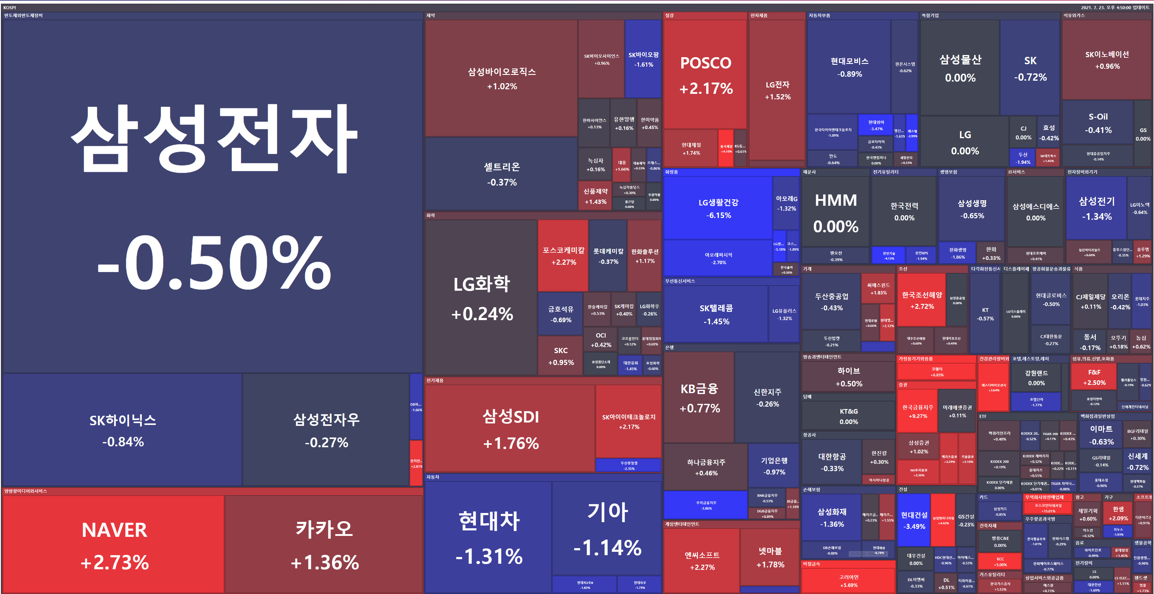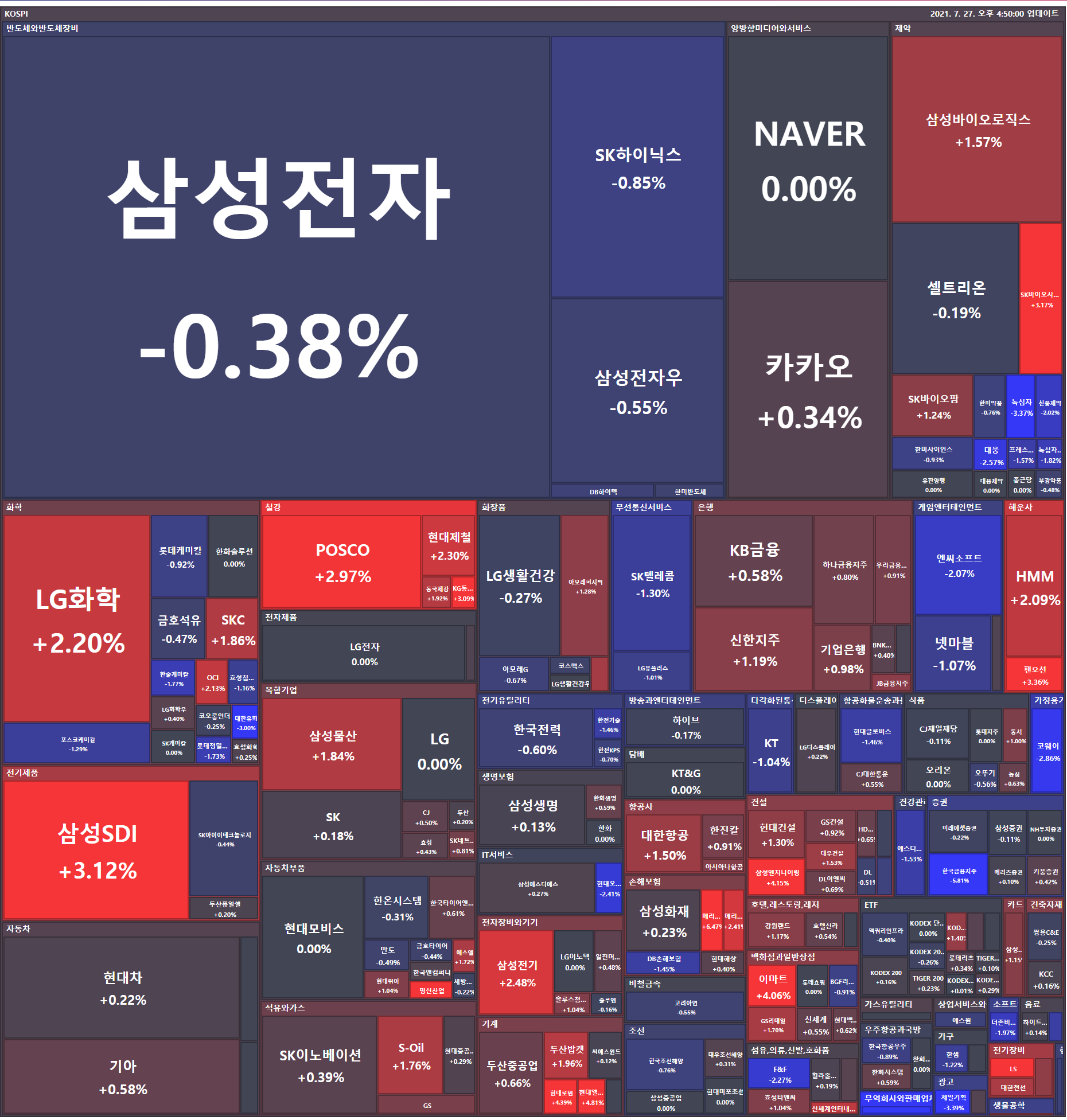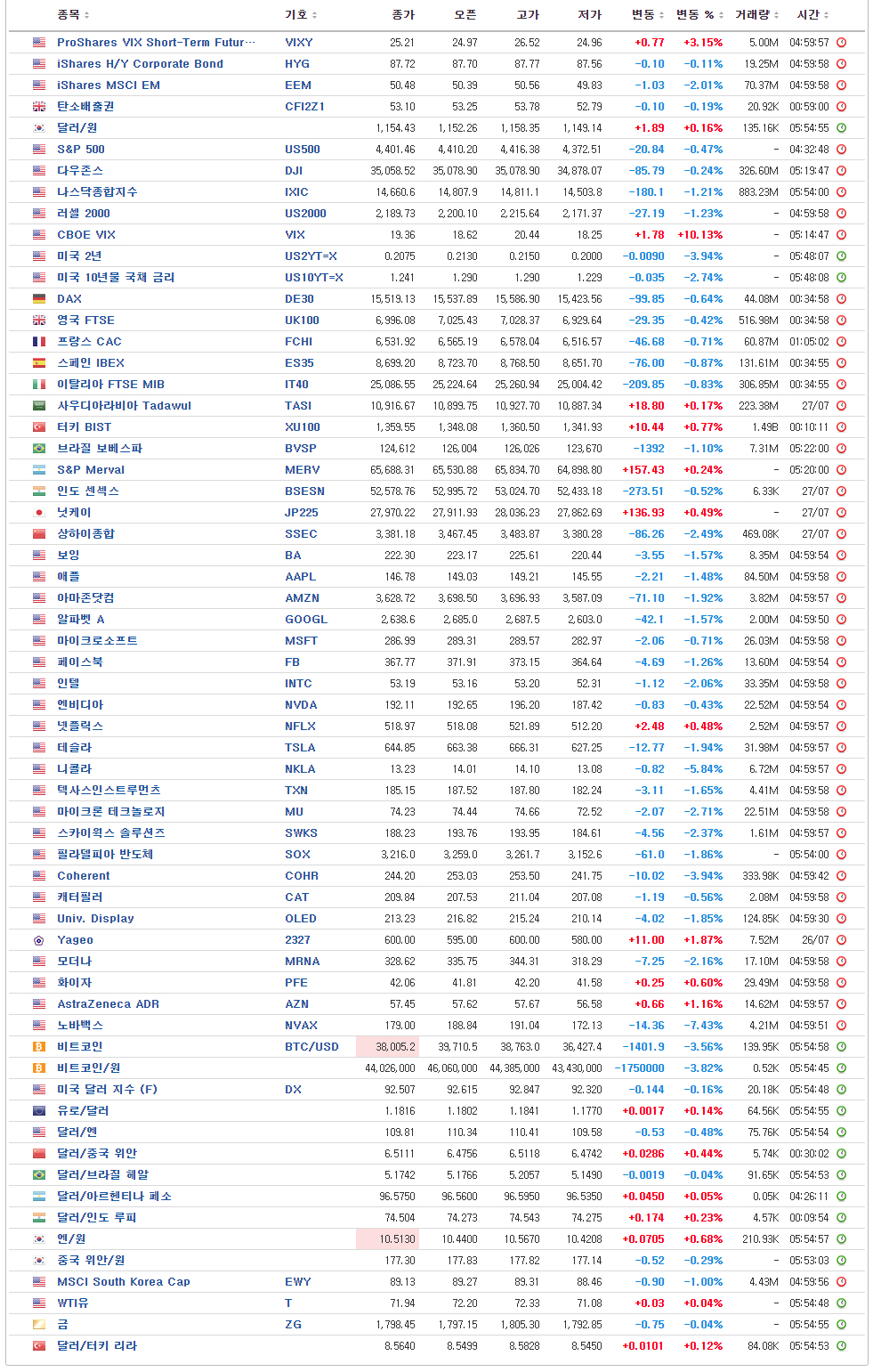 미 증시는 테슬라가 실적 발표 후 차익 실현 매물이 출회되며 하락하자 대형기술주는 물론 반도체 등 기술주가 하락 주도. 더불어 질병통제예방센터(CDC)가 백신 접종자도 실내에서 마스크 착용 지침을 발표 할 것이라는 소식도 투자 심리 위축 요인. 그러나 실적 시즌에 대한 기대심리는 여전해 장 후반 반발 매수세가 유입되며 낙폭이 축소. 특히 델타 변이 바이러스 여파로 연준이 예상보다 덜 매파적인 내용을 언급 할 것이라는 기대 심리도 반영되며 낙폭 축소 마감(다우 -0.24%, 나스닥 -1.21%, S&P500 -0.47%, 러셀2000 -1.13%)