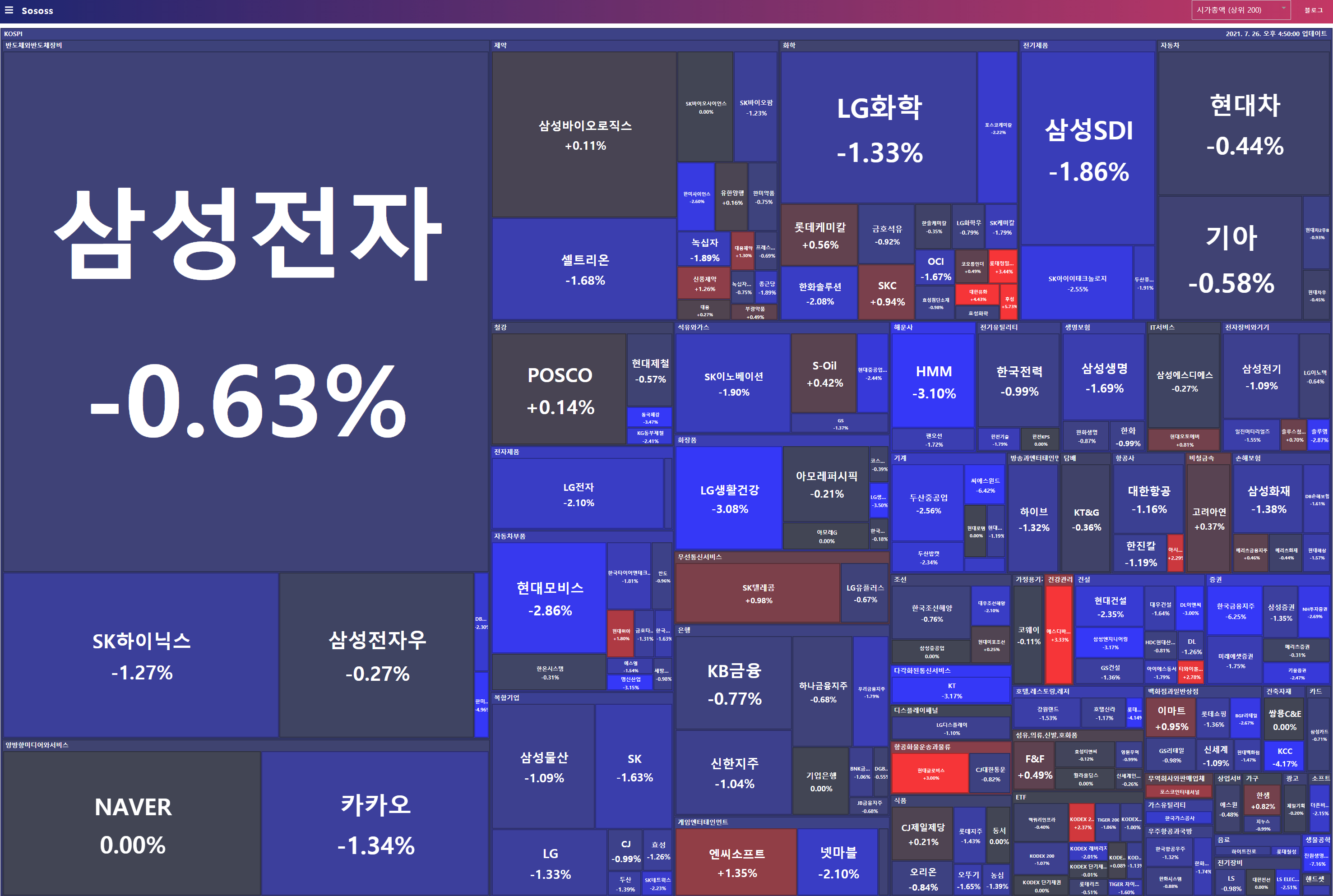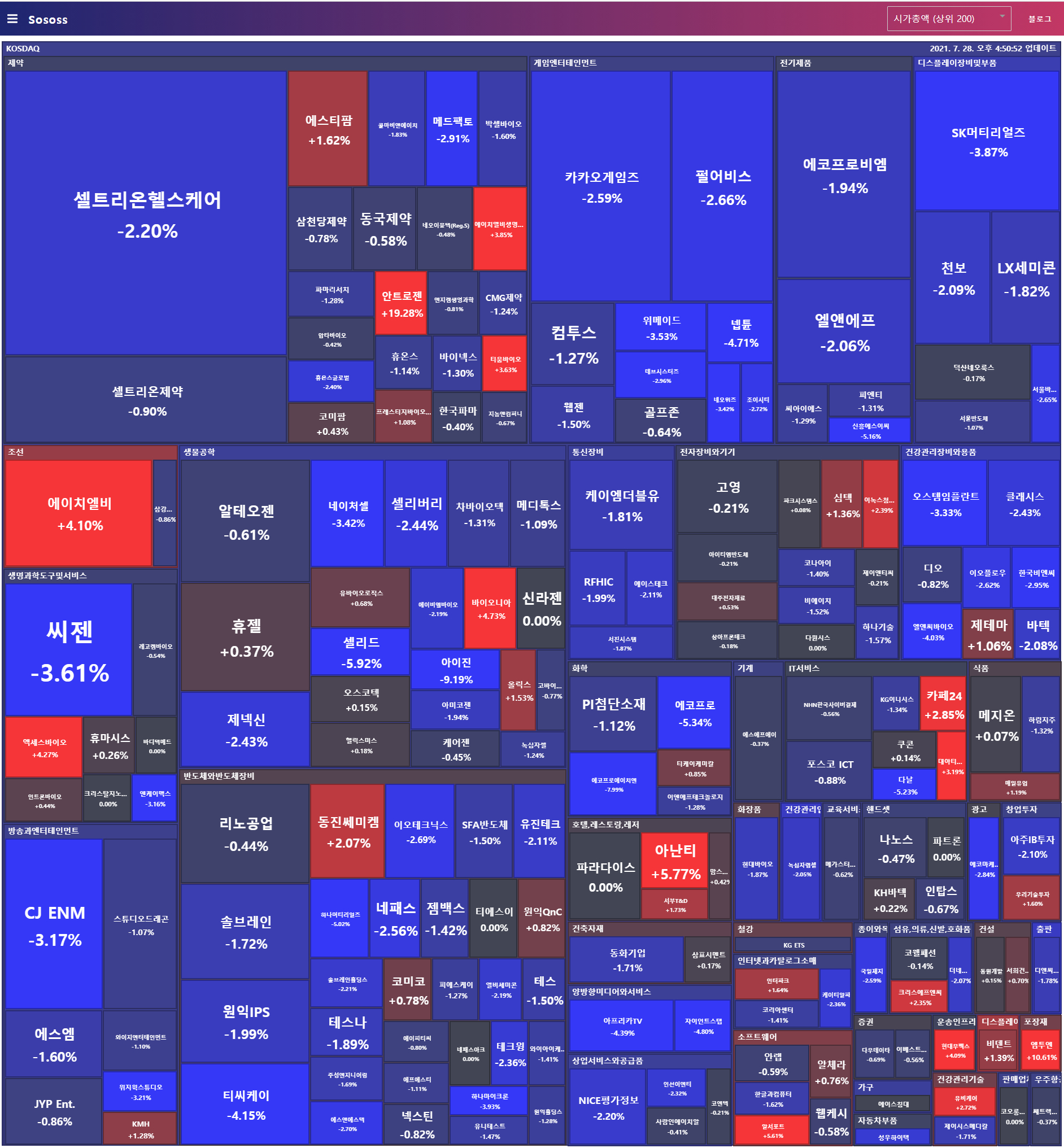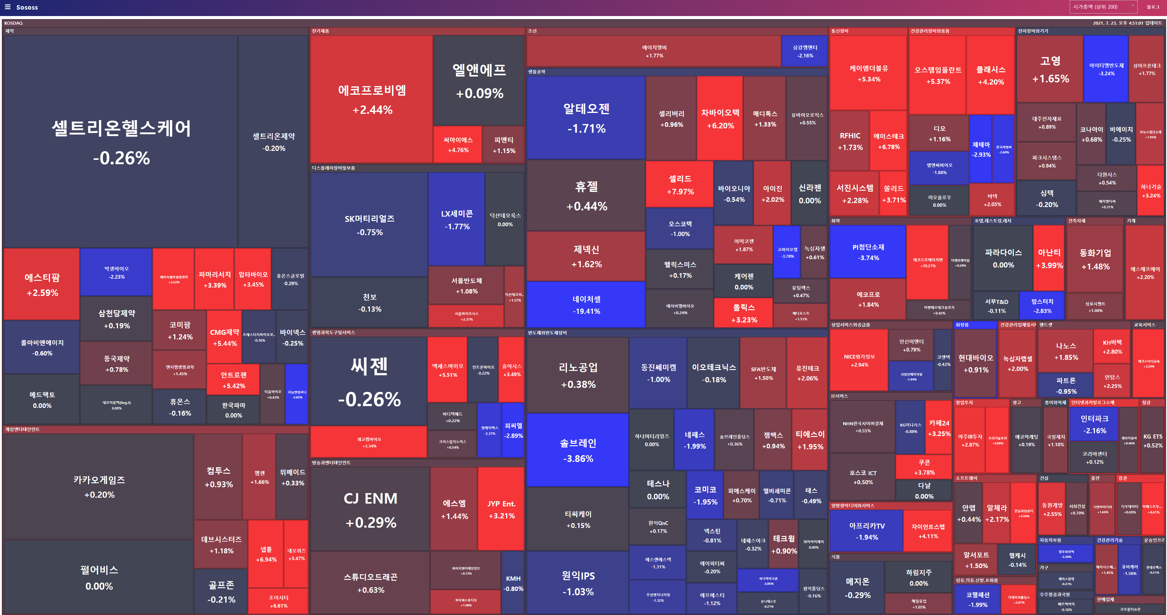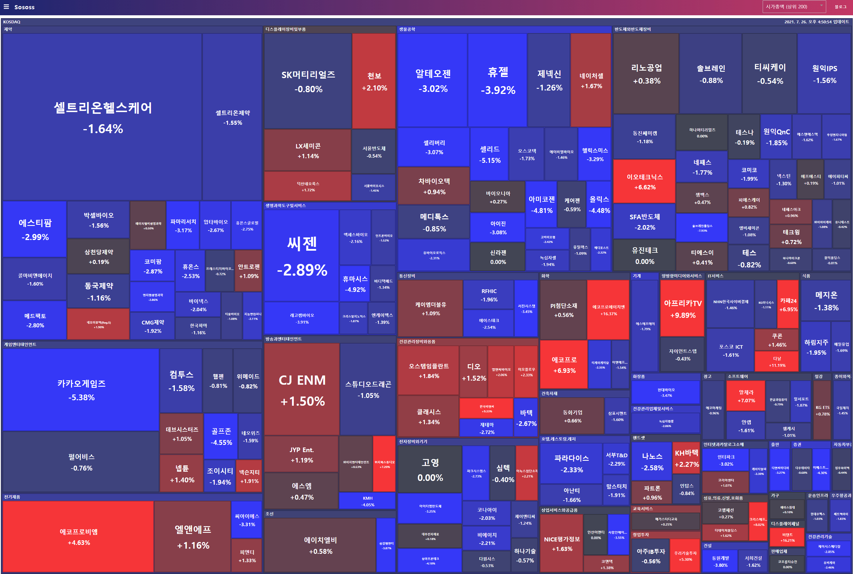 미 증시는 테슬라가 실적 발표 후 차익 실현 매물이 출회되며 하락하자 대형기술주는 물론 반도체 등 기술주가 하락 주도. 더불어 질병통제예방센터(CDC)가 백신 접종자도 실내에서 마스크 착용 지침을 발표 할 것이라는 소식도 투자 심리 위축 요인. 그러나 실적 시즌에 대한 기대심리는 여전해 장 후반 반발 매수세가 유입되며 낙폭이 축소. 특히 델타 변이 바이러스 여파로 연준이 예상보다 덜 매파적인 내용을 언급 할 것이라는 기대 심리도 반영되며 낙폭 축소 마감(다우 -0.24%, 나스닥 -1.21%, S&P500 -0.47%, 러셀2000 -1.13%)