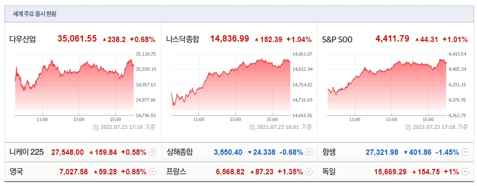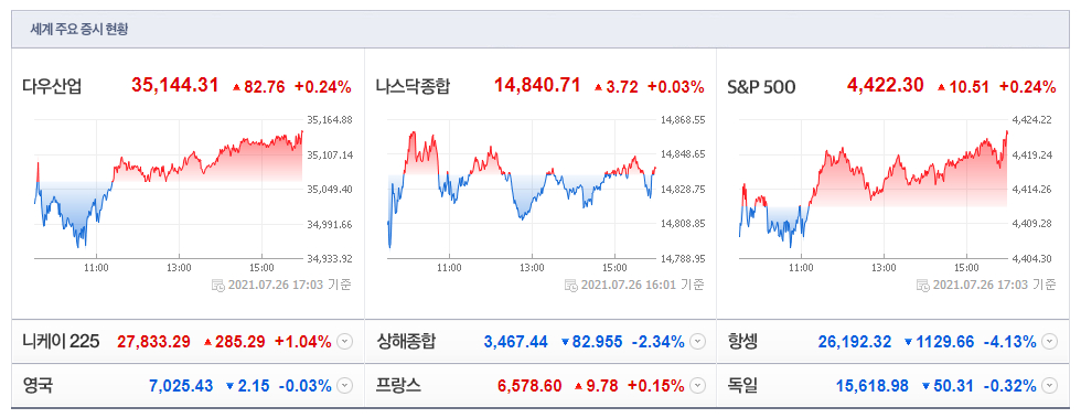 이날 투자자들의 관심사는 기업들의 실적 발표와 연방준비제도(연준·Fed)의 FOMC 정례회의, 코로나19 델타 변이에 대한 우려 등이었다. 연준은 이날 FOMC에서 자산 매입 프로그램 축소를 위한 목표치로의 진전을 이뤘다고 평가해 향후 회의에서의 테이퍼링 축소 가능성을 시사했다. 연준은 다만 다가올 회의에서 이러한 진전을 계속 평가할 것이라고 언급해 추가적인 논의가 필요함을 시사했다. 파월 의장은 자산 매입 프로그램의 조정은 지표에 달렸다는 점을 강조했으며, 테이퍼링 시기는 결정되지 않았다고 했다. 파월 의장은 또 완전 고용을 향한 상당한 추가 진전에서는 아직 멀었다며 강한 고용 수치를 보길 원한다고 말했다.