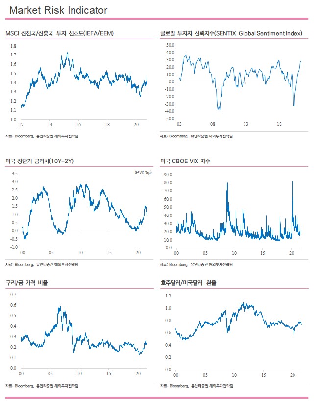 유럽증시는 아시아 증시 약세와 FOMC를 주시하며 혼조세로 마감. 금일 중국 당국이 텐센트뮤직에게 독점적 음악 저작권을 포기하도록 압박하며 지속적인 테크 기업 규제 행보를 보이자 중국 증시는 2% 하락 마감. 이 영향은 유럽증시에 미치며 텐센트의 지분 28.9%를 보유한 포르쉬스(PRX)가 금일 8.9% 하락하여 STOXX600 내 가장 큰 하락 폭 시현. 또한, 27~28일 진행될 FOMC에서 구체적 테이퍼링 논의가 있을지 주목하며 시장은 대기모드에 돌입하여 혼조세로 마감. 금일 상승 업종으로는 에너지(+2.6%), 금융(+0.9%), 소재(+0.7%)업종이 올랐으며, 지난 유럽중앙은행(ECB) 통화정책회의 이후 오는 9월 만료될 은행의 자사주 매입 제한을 해지하기로 결정하며 은행주 전반이 상승 시현. 반면 필수소비재(-0.9%)와 헬스케어(-1.6%)는 약세로 마감. 한편 독일 기업의 경기 신뢰도를 나타내는 7월 IFO 기업환경지수는 100.8을 기록해 예상치(102.5)를 하회하였으며, 금일 독일 증시의 하방 압력으로 작용한 모습.