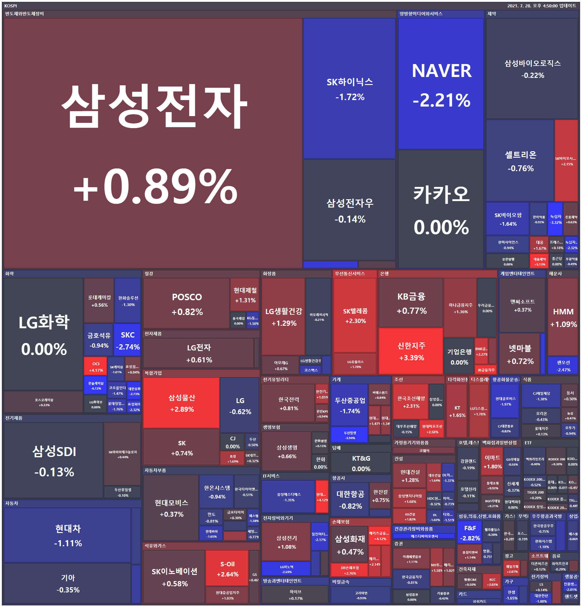 미국 증시는 FOMC 결과에 혼조세로 마감. 금일 연방공개시장위원회(FOMC) 정례회의 이후 제롬 파월 미 연준 의장은 시장의 예상대로 기준금리 동결. 시장 최대 관심사인 테이퍼링에 관해서는 델타 확산 우려에도 불구하고 경제 목표에 진전이 이뤄지고 있다고 평가하는 한편, 완전한 목표치에 도달하지 않았음을 시사하며 즉각적인 자산 매입 축소를 하지 않을 것을 시사. 다만, 다음 회의에서 이를 평가할 것이라고 발언하였으며, 이를 두고 미국 언론은 매달 1200억 달러 규모의 자산매입 축소에 대한 신호를 준 것으로 평가. 해당 발언에 시장은 크게 반응하지 않은 모습. S&P500은 발언 이후 상승 전환하였으나 보합세로 마감하였고, 블루칩 중심의 다우지수는 비자(V/-1.6%)와 맥도날드(MCD/-1.9%)가 약세를 시현한 영향으로 소폭 하락 마감하며 뉴욕증시는 혼조세로 마감. 최근 실적을 발표한 대형 기술주 FAAMG의 주가 역시 혼조세 시현. 전일 실적을 발표한 알파벳(GOOGL/+3.2%), 마이크로소프트(MSFT/-0.1%), 애플(AAPL/-1.2%) 은 모두 견조한 실적을 발표, 다만 마이크로소프트는 클라우드 컴퓨팅 사업인 애저(Azure)의 성장세 둔화, 애플은 매출 증가세 둔화에 약세 시현. 시장은 금일 장 마감 후 예정된 페이스북(FB/+1.5%) 실적 발표와 29일(현지시간) 예정된 아마존(AMZN/+0.1%)의 실적을 주시하는 모습.