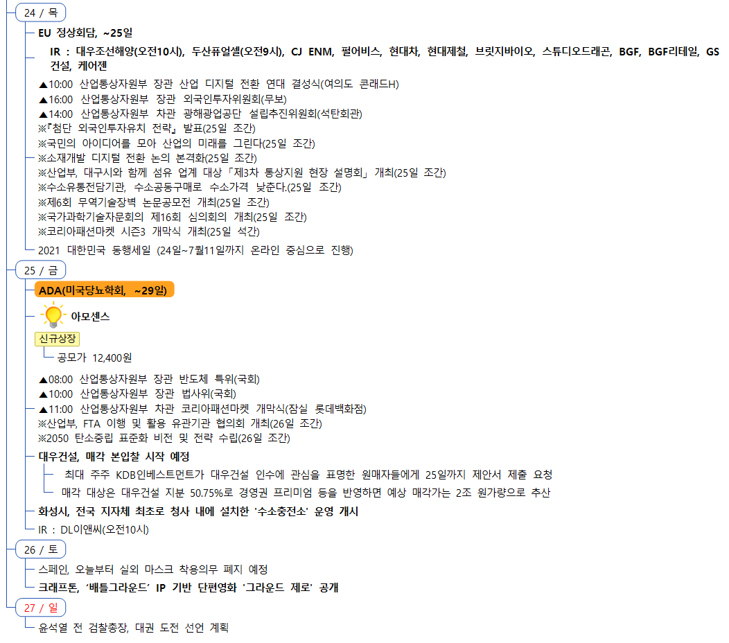 다만, 6월 20일까지의 한국 수출 호조(29.5%, YoY) 소식 등 견조한 펀더멘털이 유효하다는 전망이 지수 하단을 지지(코스피 -0.8%, 코스닥 -0.5%)