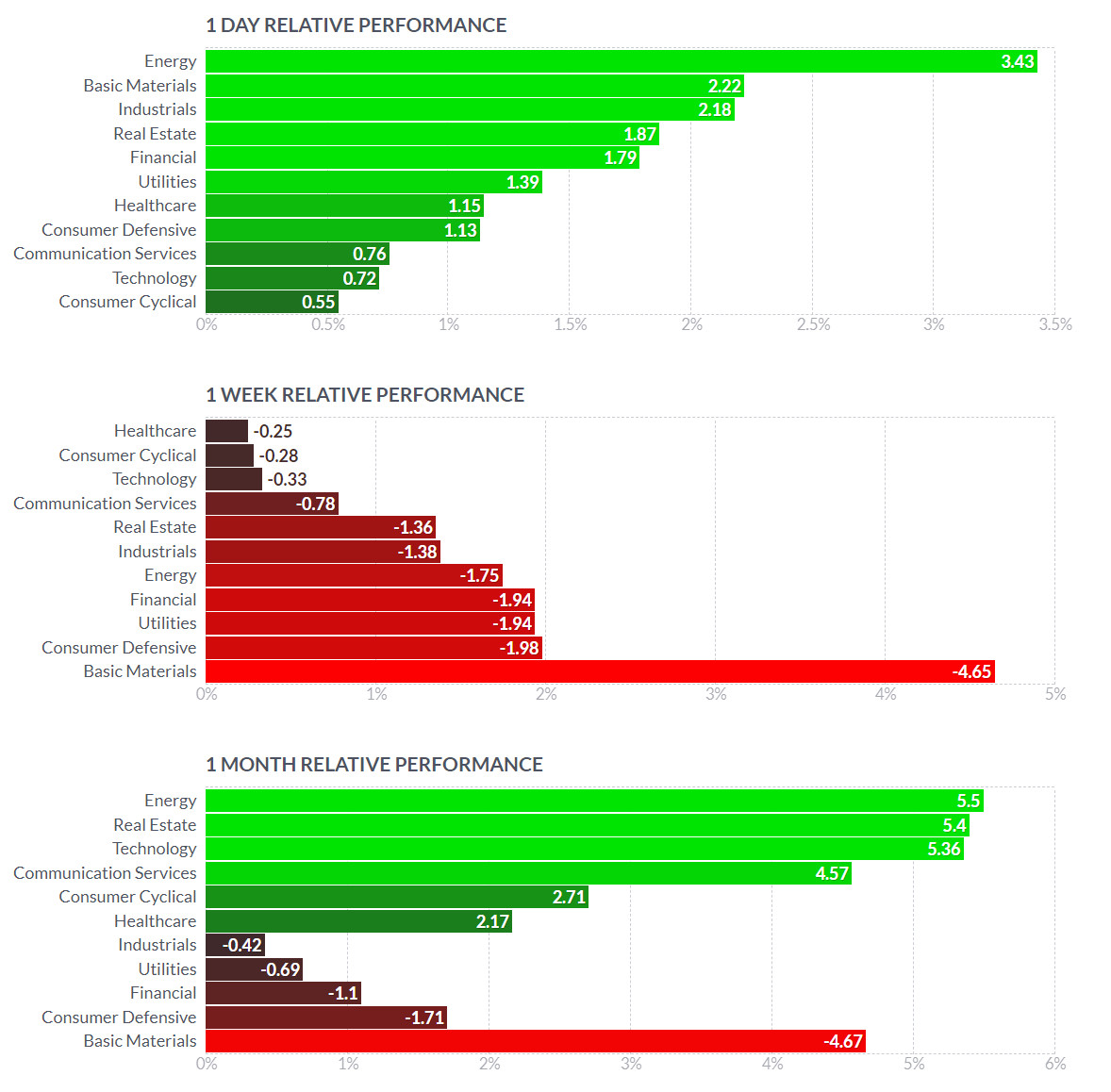 업종별로는 에너지(+4.3%), 금융(+2.4%), 산업재(+2.2%), 소재(+2.1%) 등 전업종이 강세.
