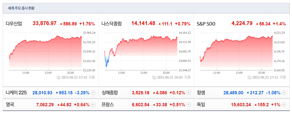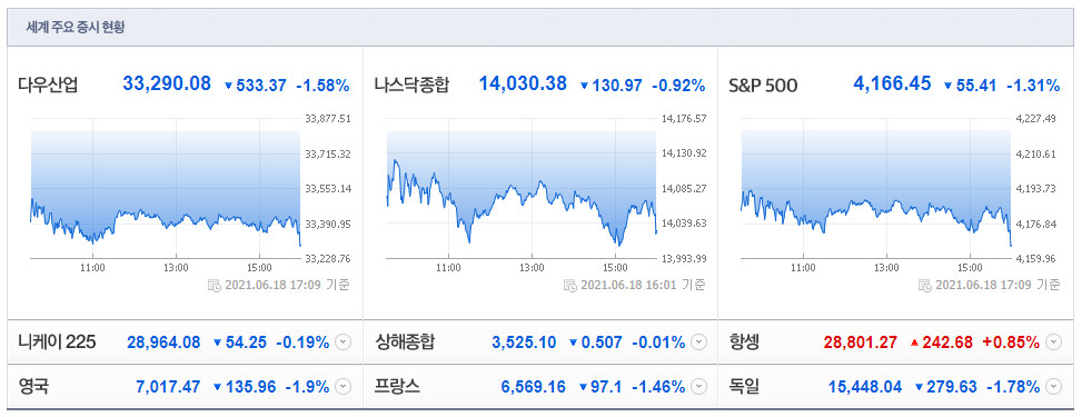 미국증시는 이날 제임스 불러드 세인트루이스 연준(FED) 총재의 발언에 내림세로 마감. S&P500지수는 1.3% 하락한 4,166선에서 거래를 마쳤고, 다우지수는 1.6% 하락해 33,291.53에 마감. 나스닥 지수는 0.9% 하락한 14,030.38에 마감. 개별종목으로는 미국 주택 건설업체 레너(LEN)에 대한 제이피 모건의 투자의견이 ‘비중확대’로 상향조정되며 4.5% 상승, 온라인 지급 결제 회사 페이팔(PYPL)이 새롭게 출시하는 상품에 대한 수수료를 상향한다는 소식에 1.9% 상승. 한편, 제약회사 오파자임(ORPH)의 신약 치료제에 대한 미국 FDA 승인 거절 소식에 49.7% 급락. 이날 주요 이슈로 연준 내에서 비둘기파(통화 완화 선호)로 분류되는 블러드 총재가 CNBC와의 인터뷰에서 연준의 첫 금리 인상 시기를 2022년 말로 예상한다고 발언. 또한, 테이퍼링에 대한 논의가 공식적으로 개시했다고 언급하며 글로벌 시장을 냉각시킨 모습. 증시 전문가들은 연준이 조기 긴축 신호를 보낼수록 시장의 불안이 커질 것으로 예상, 이날 변동성지수(VIX)는 전장보다 12% 이상 오르며 5월 말 이후 최고치로 상승. 아울러, 세계보건기구(WHO)는 이날 기자회견에서 전염력이 강한 코로나 19 델타 변이가 세계 지배적인 변이가 될 수 있다고 경고하며 코로나 19 펜데믹에 대한 우려가 커진 모습. 전 세계 코로나 19 누적 사망자는 400만 명을 넘어섰으며 변이 바이러스의 영향으로 6개월도 안 돼 200만 명이 증가.