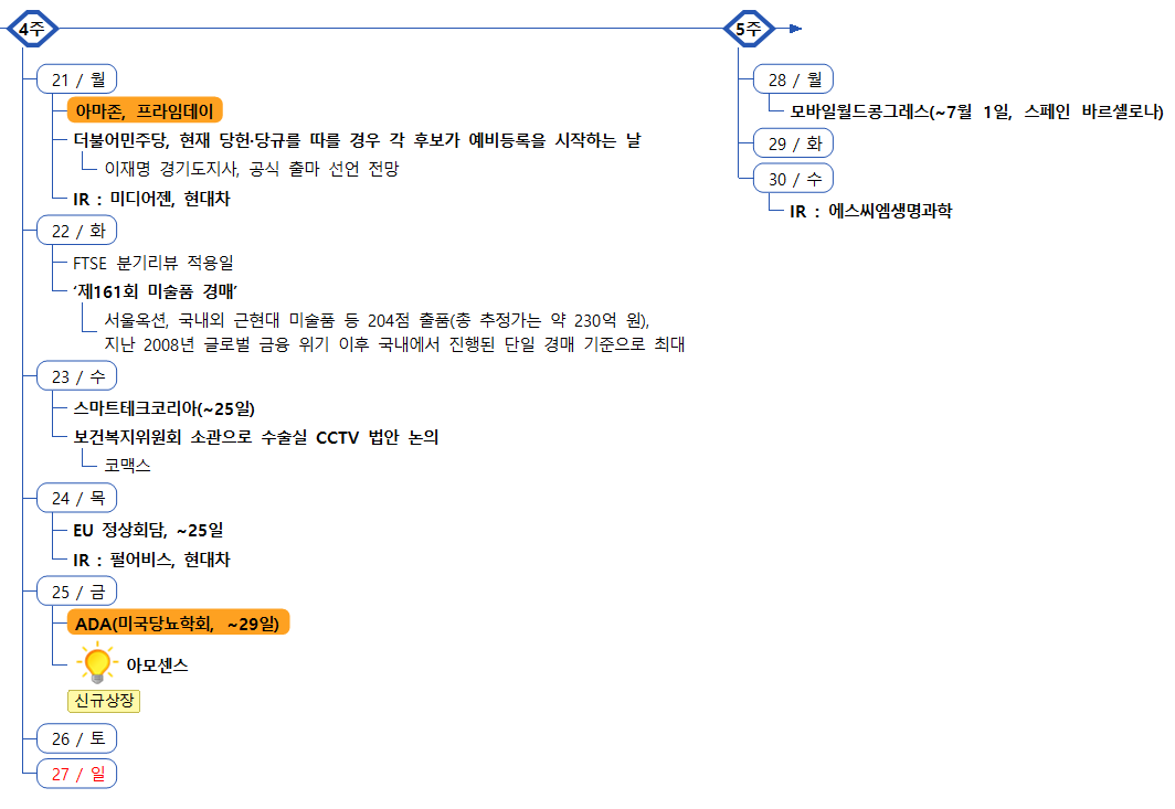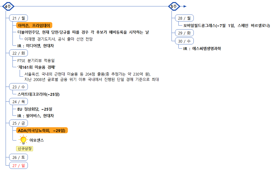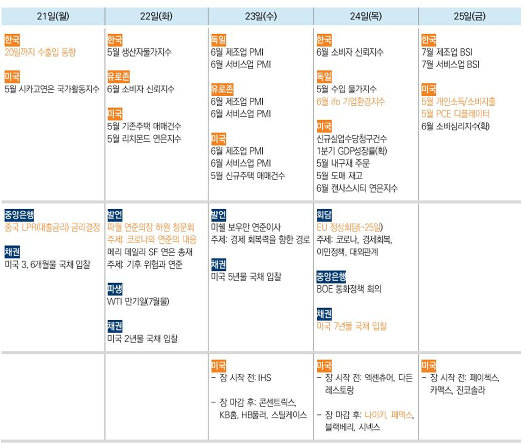 한국 증시는 6월 FOMC 여진이 지속되는 가운데, 미국 금리 하락, 원자재 가격 급락 등으로 업종간 차별화된 주가흐름을 보일 것으로 예상.