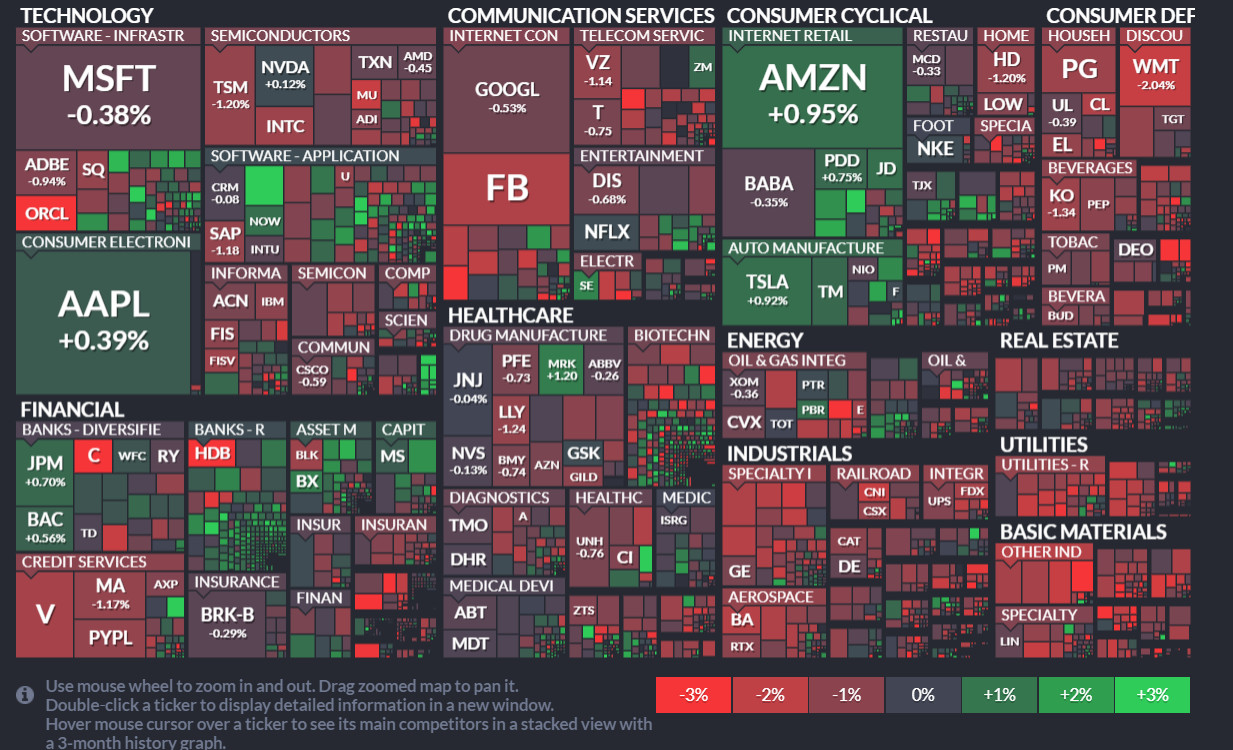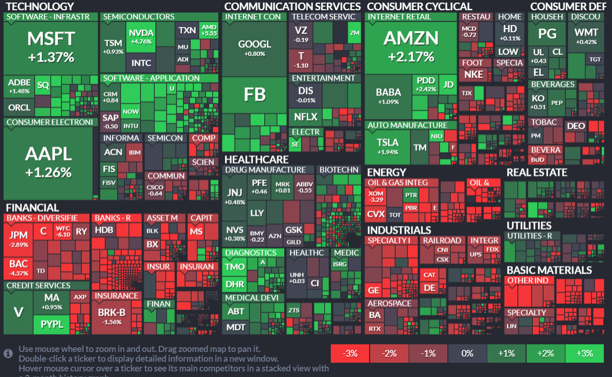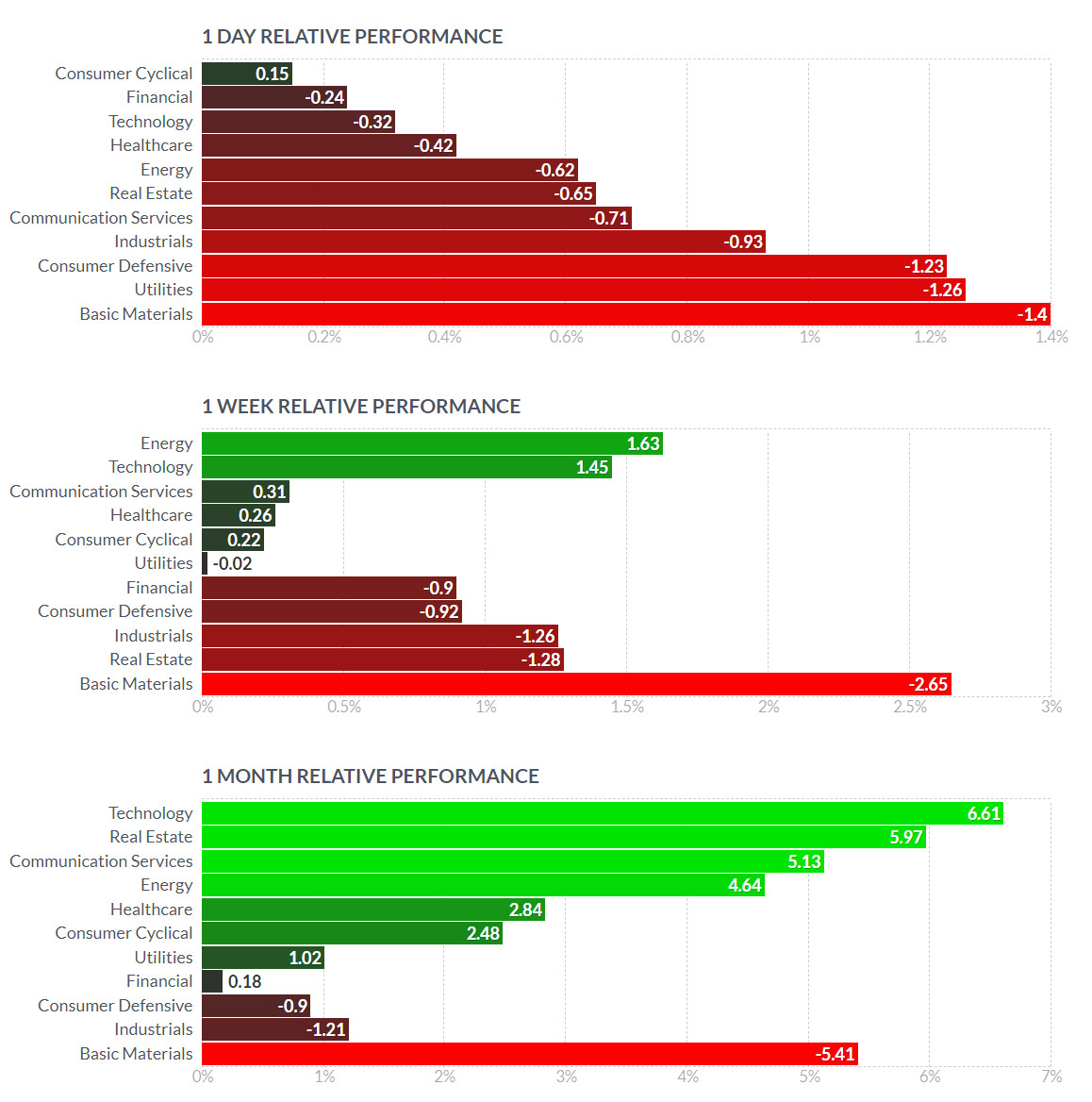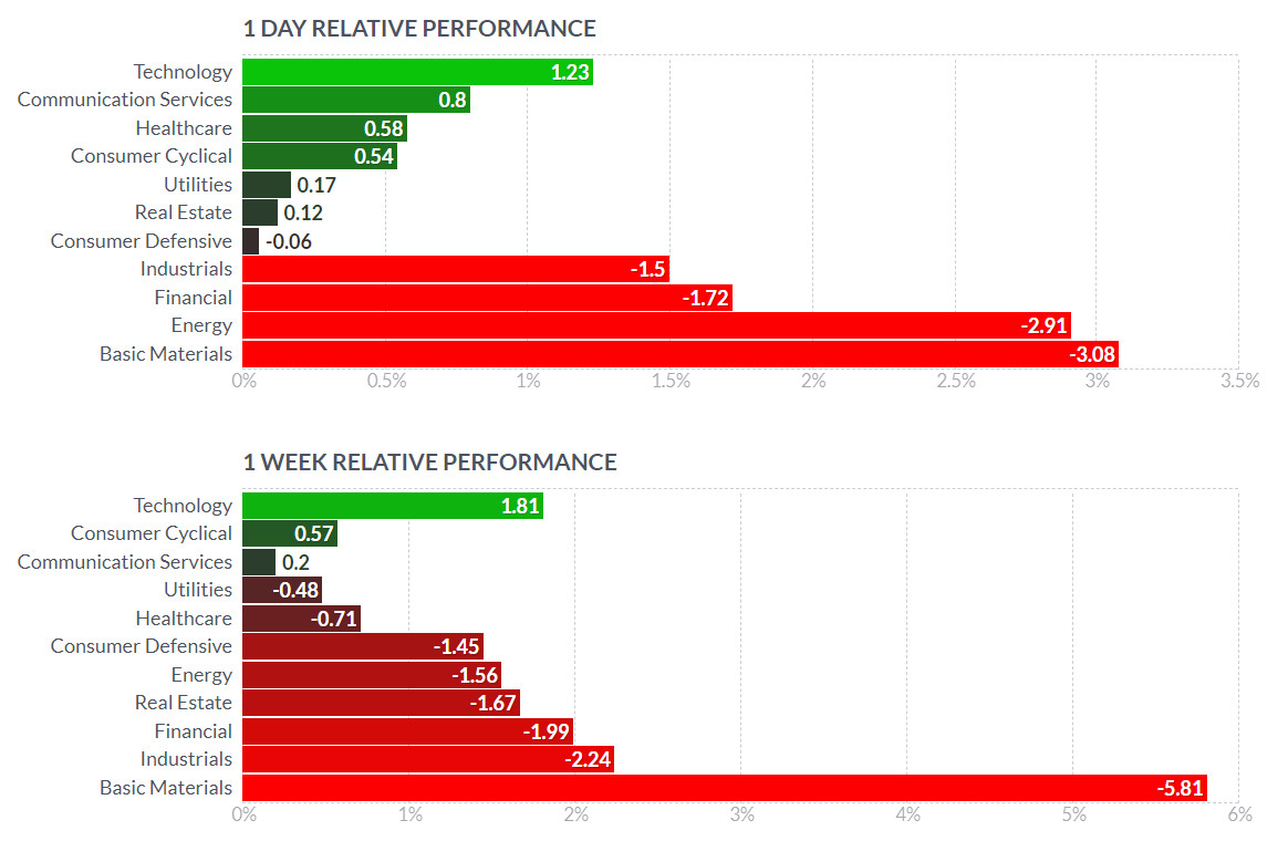 업종별로는 기술(+1.2%), 헬스케어(+0.8%), 경기소비재(+0.6%) 등이 강세, 에너지(-3.4%), 금융(-2.9%), 소재(-2.2%) 등이 약세