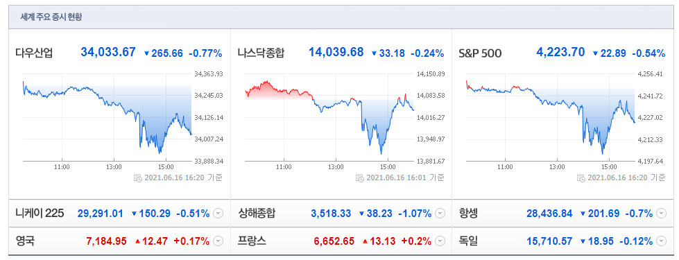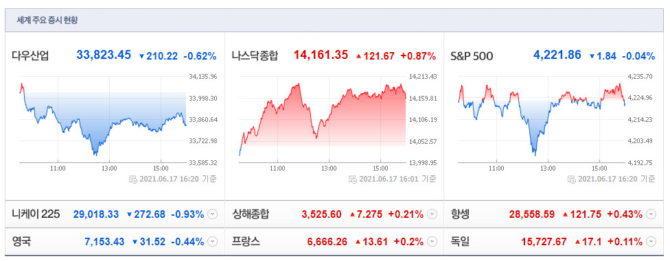 - 주간 실업수당 청구건수가 전주보다 3만 7천명 증가하면서 다시 40만명대(당초 36만명 예상)로 올라선 것이 악재로 인식. 고용회복 속도가 둔화되기 시작했는데 6월 FOMC에서 테이퍼링 논의를 시작하면서 경기에 부담을 줄 수도 있다는 인식이 생겨남. 6월 필라델피아 제조업 지수도 30.7로 전월 31.5에서 하락하며 2개월 연속 둔화