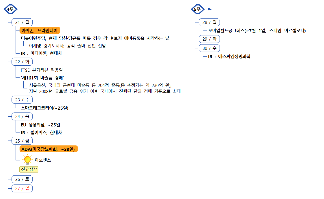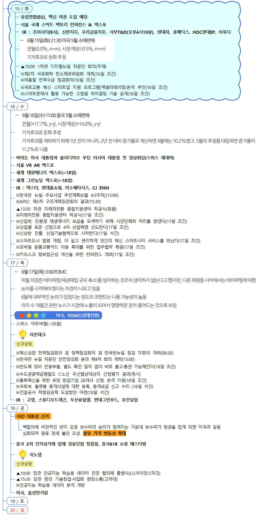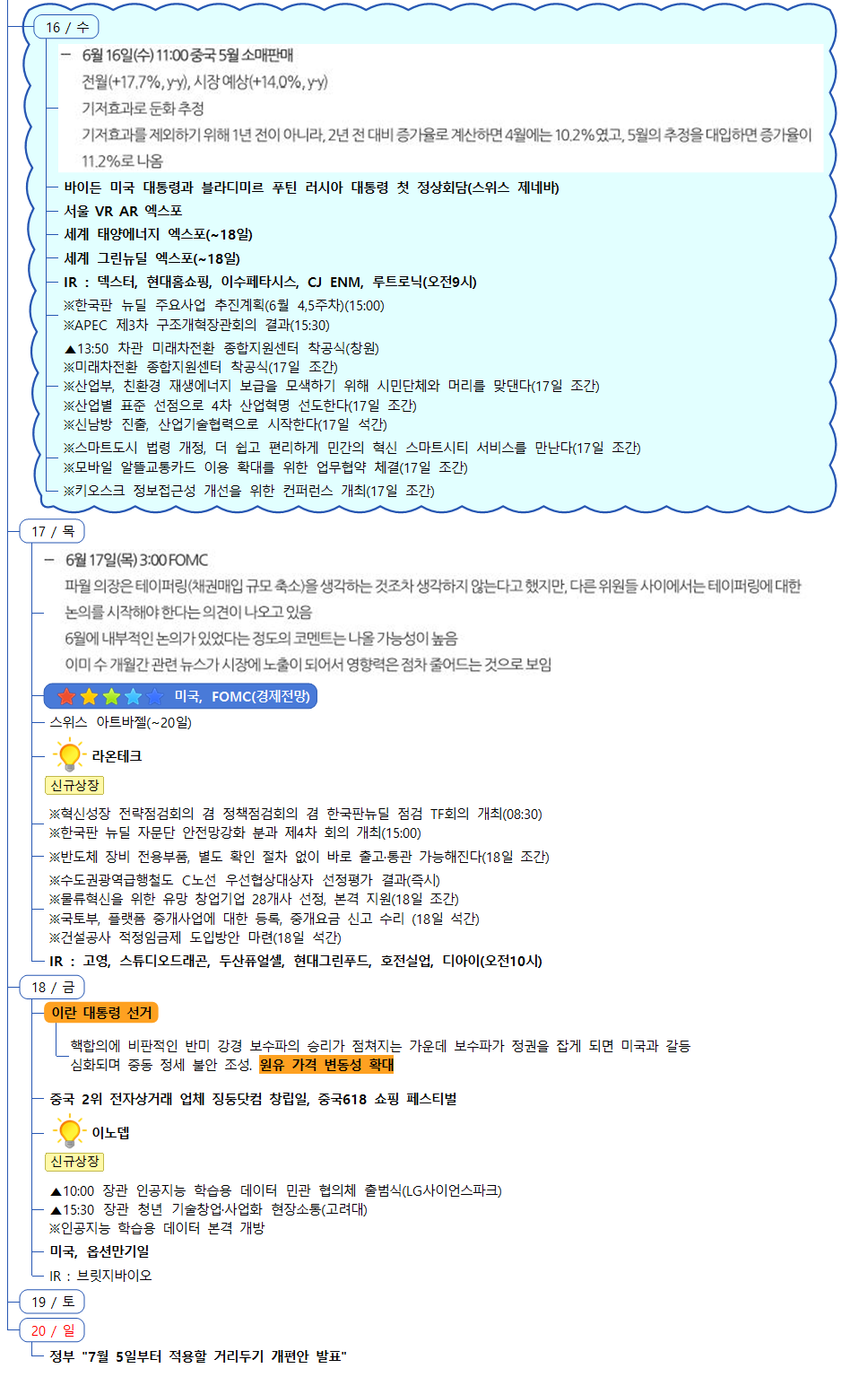 한국 증시는 6월 FOMC 경계심리로 약보합 흐름을 보일 것으로 예상.