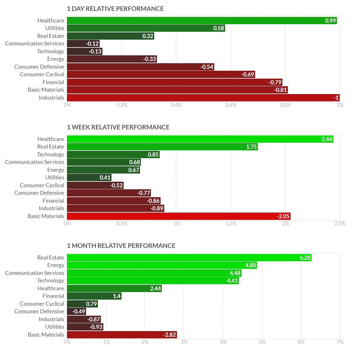 업종별로는 헬스케어(+1.0%), 유틸리티(+0.9%), 부동산(+0.2%) 등이 강세, 금융(-1.1%), 산업재(-1.0%), 소재(-0.8%) 등이 약세