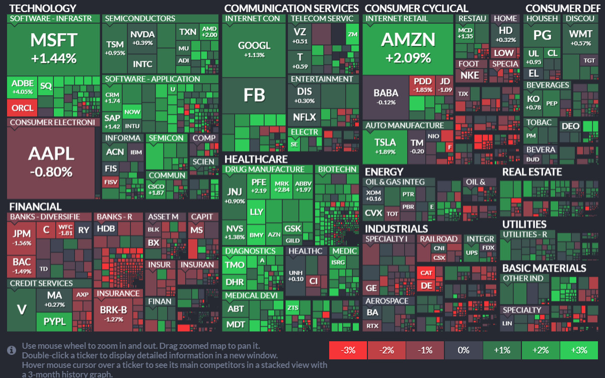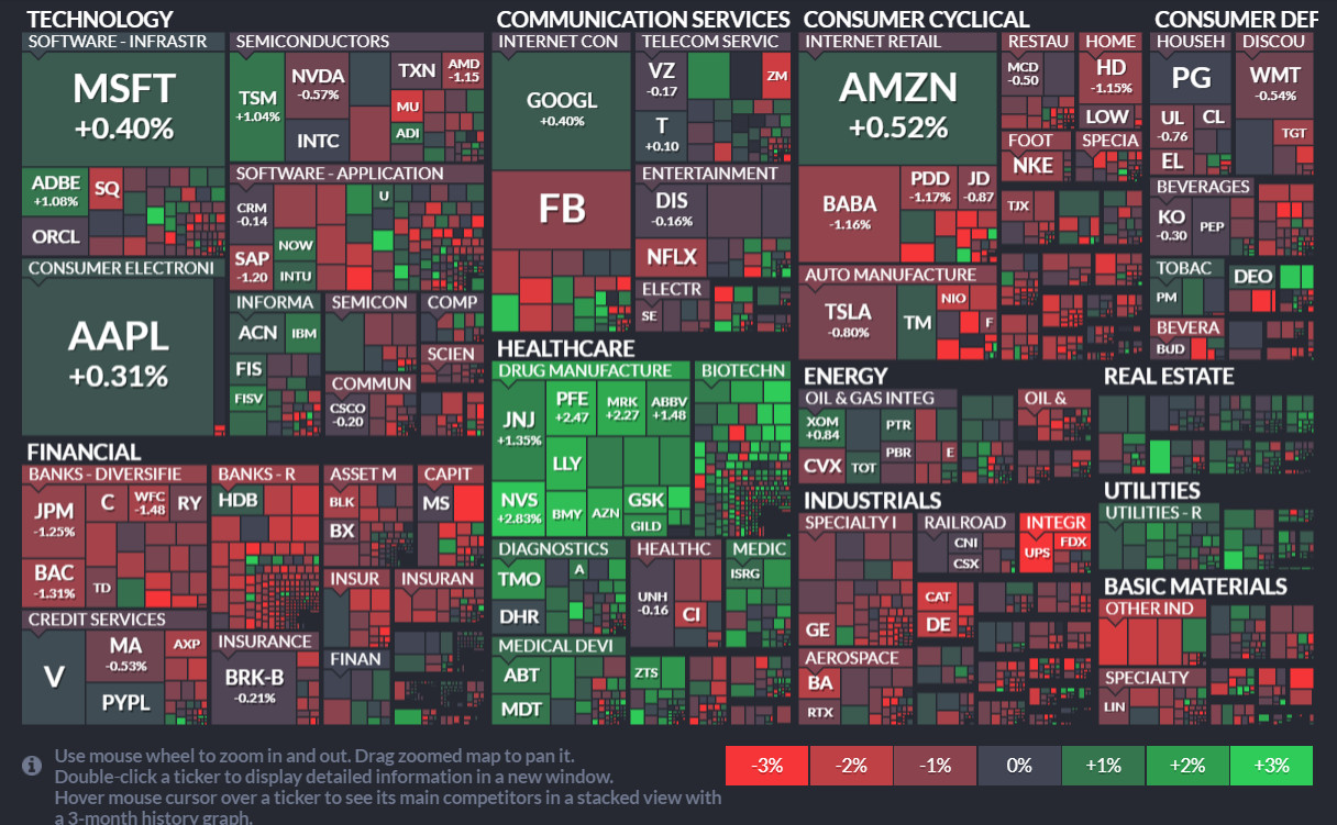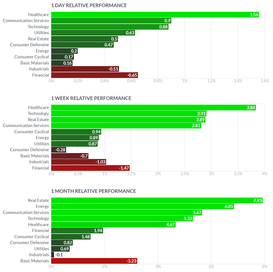 업종별로는 헬스케어(+1.7%), 부동산(1.0%), 기술(+0.8%) 등이 강세, 금융(-1.1%), 소재(-0.6%), 산업재(-0.5%) 등이 약세.