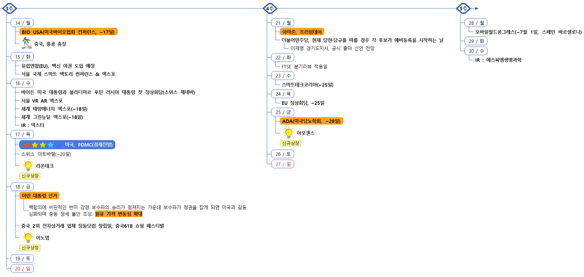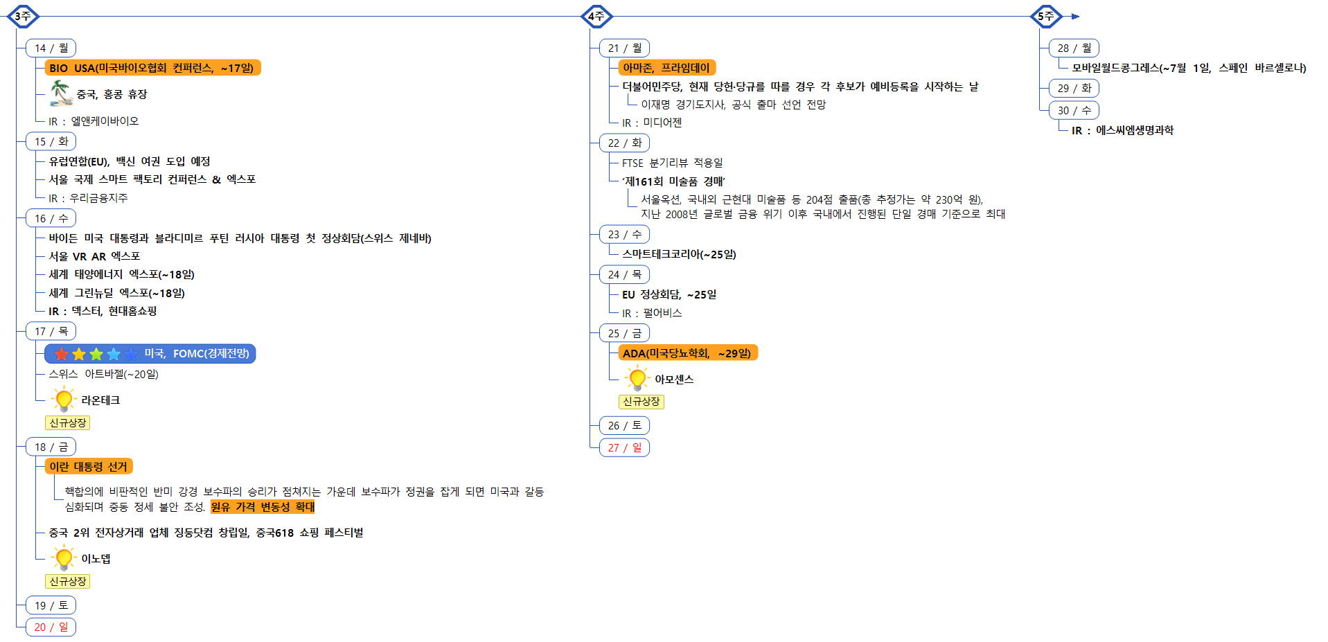 9일(수) 코스피는 한국과 미국 정부의 여행 규제 완화 소식으로 여행, 레저 등 경제 재개 관련 테마주들이 강세를 보였으나, 10일(목) 미국 소비자물가 결과 불확실성, 국내 선물옵션 동시만기일 경계심리 확산으로 외국인과 기관이 동반 순매도세에 나섬에 따라 하락 마감(코스피 -1.0%, 코스닥 -0.7%).