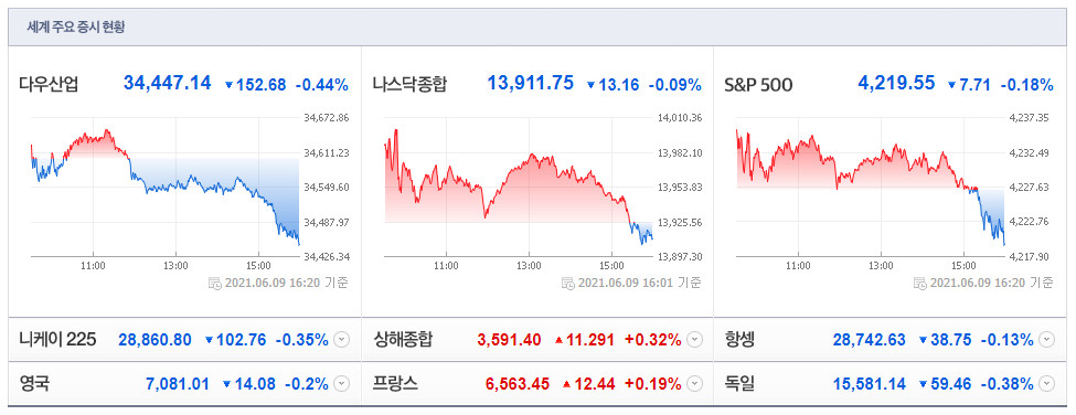 9일(수) 미국 3대 증시는 국채 입찰 호조에 따른 10년물 금리 하락으로 성장주들에게 우호적인 환경이 조성됐으나, 5월 소비자물가, ECB 통화정책회의를 앞두고 관망심리가 지속된 여파로 하락 마감(다우 -0.4%, S&P500 -0.2%, 나스닥 -0.1%).