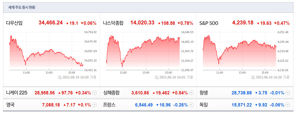 10일(목) 미국 3대 증시는 5월 소비자물가 서프라이즈에도, 일시적 인플레이션 인식 확대, 완화적인 스탠스를 보였던 ECB 정책 회의, 시장금리 하락(10년물 1.43%대 진입)에 힘입어 성장주를 중심으로 강세를 보이면서 상승 마감(다우 +0.1%, S&P500 +0.5%, 나스닥 +0.8%).
