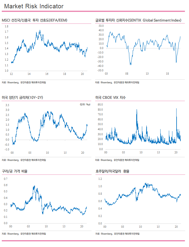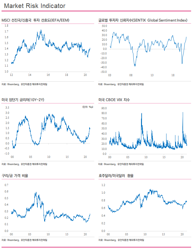 금일 테마 ETF에서 주거건축(XHB) ETF는 3.0% 올라 큰 상승 폭을 시현하였으며, 미국 질병통제예방센터(CDC)의 로셸 월렌스키 국장은 코로나 백신을 접종한 사람은 실내외에서 마스크를 쓰지 않아도 된다고 권고하며 레져/엔터테인먼트(PEJ) 테마는 1.4% 상승. 반면 일론 머스크가 비트코인으로 테슬라 결제 대금 중단을 발표하며 테슬라(TSLA)는 3.1% 하락하였으며, 이 영향으로 기술혁신(ARKK) 테마 ETF는 2.6% 하락 마감.