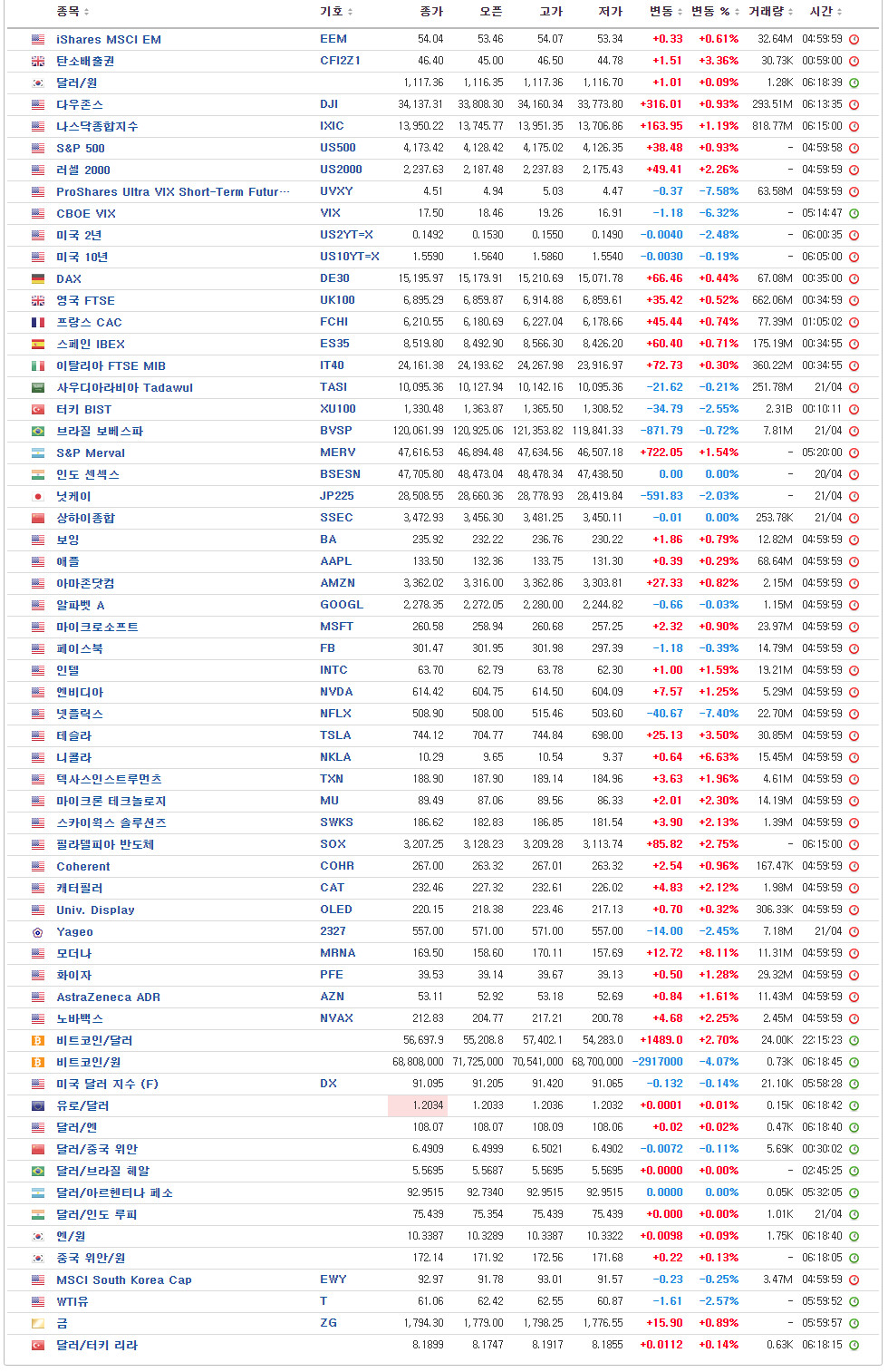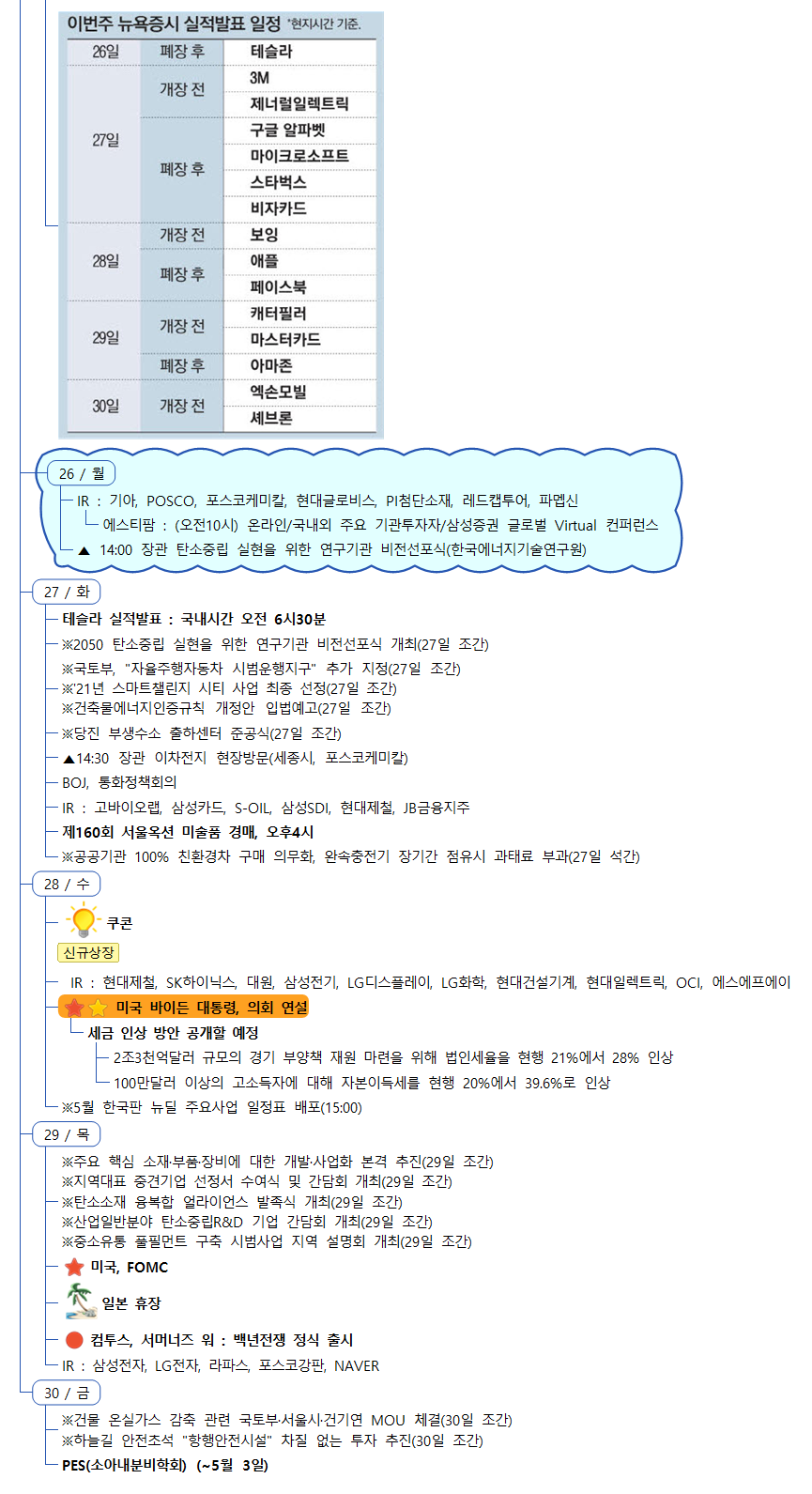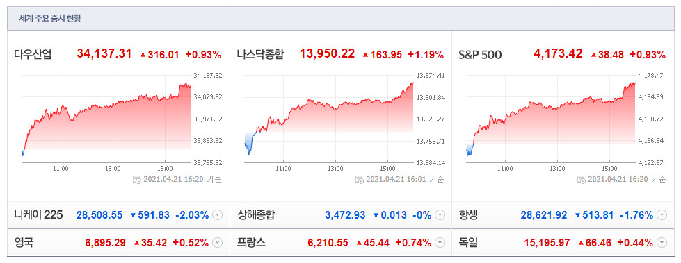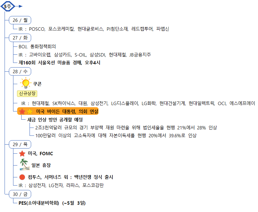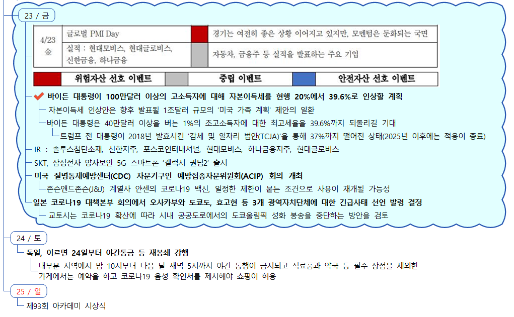 미 증시는 양호한 경제지표, 실적발표에도 불구하고 상승 탄력이 약화된 가운데 혼조 출발. 특히 온건한 ECB 통화정책회의와 기후 정상회담 영향으로 상승세를 보이기는 했으나 개별 기업에 국한된 움직임. 그러나 장 후반 ‘자본이득세’ 인상 추진 소식이 전해지자 향후 법인세를 비롯해 세금 정책 변화 가능성이 높아지자 매물 출회되며 하락 마감. 이미 알려진 내용이나 상승 탄력 둔화가 이어지고 있어 이를 빌미로 매물 출회된 것으로 추정(다우 -0.94%, 나스닥 -0.94%, S&P500 -0.92%, 러셀2000 -0.31%)
