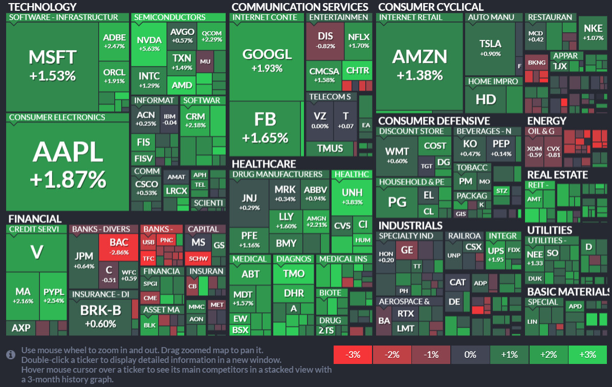 미 증시는 발표되는 기업들의 양호한 실적 결과로 1분기 어닝시즌에 대한 기대가 확산되며 상승 출발. 더불어 주요 경제 지표 개선도 긍정적인 영향. 한편, 국채금리가 하향 안정을 보이자 기술주 중심의 나스닥이 상대적으로 강세 보임. 장 마감 앞두고 일부 매물 출회되기도 했으나 그 폭은 제한된 가운데 상승 마감. 미 증시는 금리 변화로 전일과 달리 성장주가 상승을 주도하는 등 업종별, 스타일별 로테이션 속도는 빠르게 진행된 가운데 실적 개선 기대가 높은 종목군 중심 강세(다우 +0.90%, 나스닥 +1.31%, S&P500 +1.11%, 러셀2000 +0.42%)