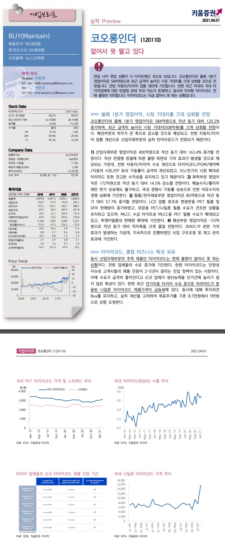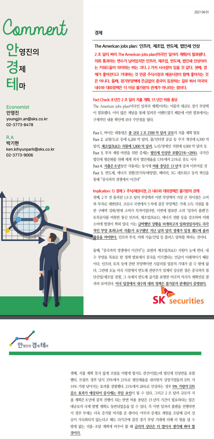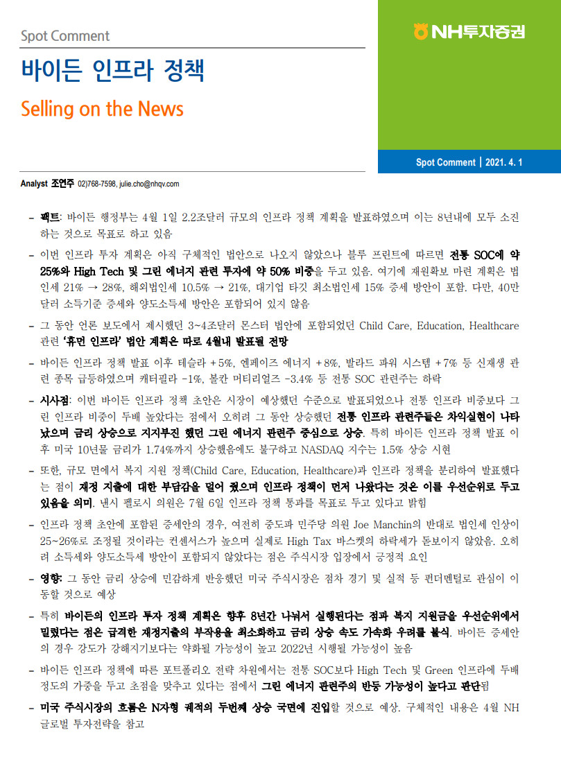 - SK하이닉스(+6.04%)는 DRAM 가격 상승 및 출하량 증가로 인해 2분기부터 실적 개선이 예상되는 가운데, 바이든 대통령의 인프라 투자 계획의 일부인 반도체 산업 지원의 수혜가 기대되면서 강세