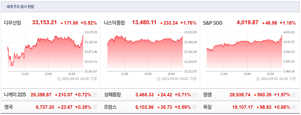 - 미국 3대 증시는 주간 실업지표 부진에도, 바이든 정부의 인프라투자 기대감 지속, 3월 ISM 제조업 PMI 호조 등으로 경기 모멘텀이 강화될 것이라는 전망에 힘입어 상승 마감(S&P500은 사상 최초로 4,000선 돌파)