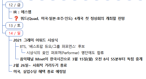 - 미 하원에서는 지난주 상원에서 통과된 1,400달러 현금 지급 등이 1.9조달러 부양책 수정안을 220대 211로 통과시켰으며, 해당 법안은 백악관으로 넘어감에 따라 12일(금) 중에 바이든 대통령이 서명할 예정