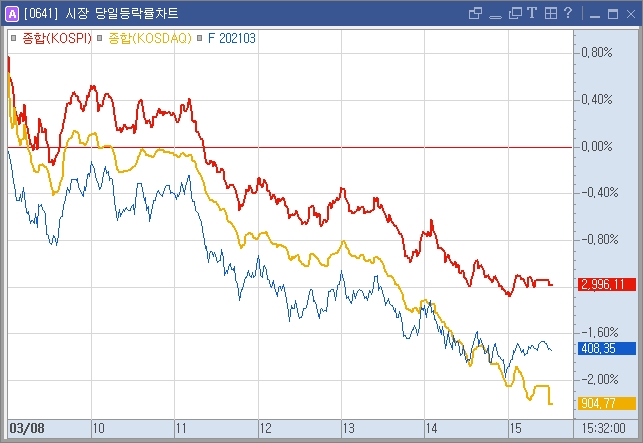 코스피 1% 내린 2996.11, 코스닥 2.03% 하락 904.77