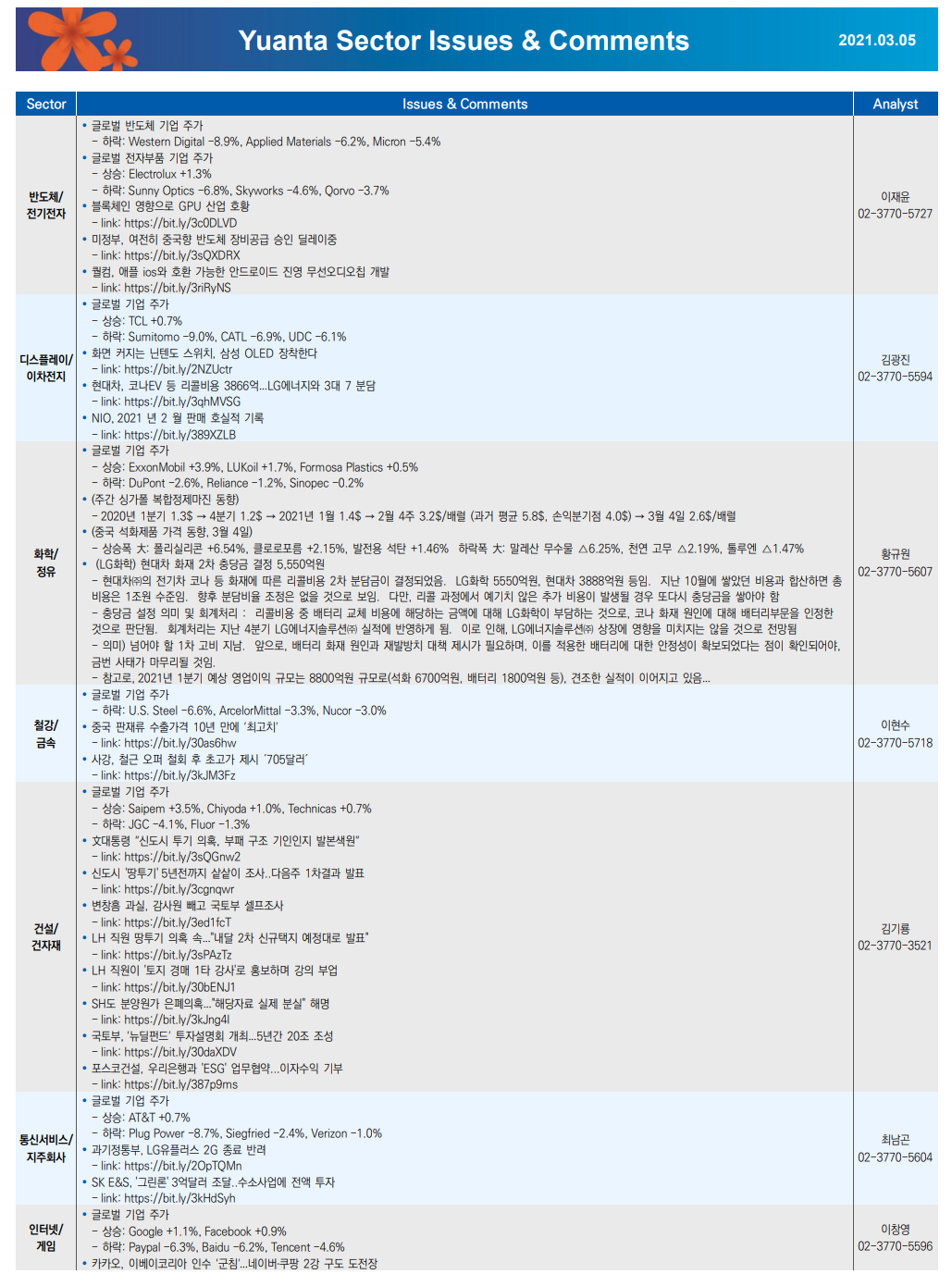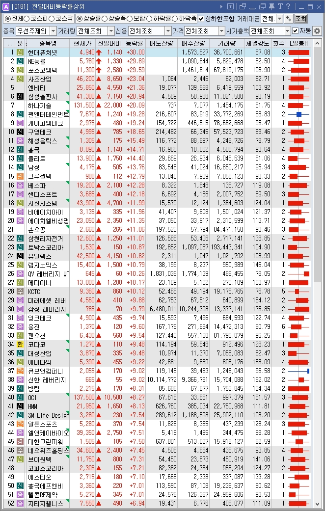 - 팬오션(+9.54%), HMM(+8.1%) 등 해운 업종 종목들은 원자재 가격상승 사이클에 대한 기대감이 부각되면서, 건화물 벌크 시황의 개선으로 운임이 상승했다는 소식이 호재로 작용하면서 동반 강세