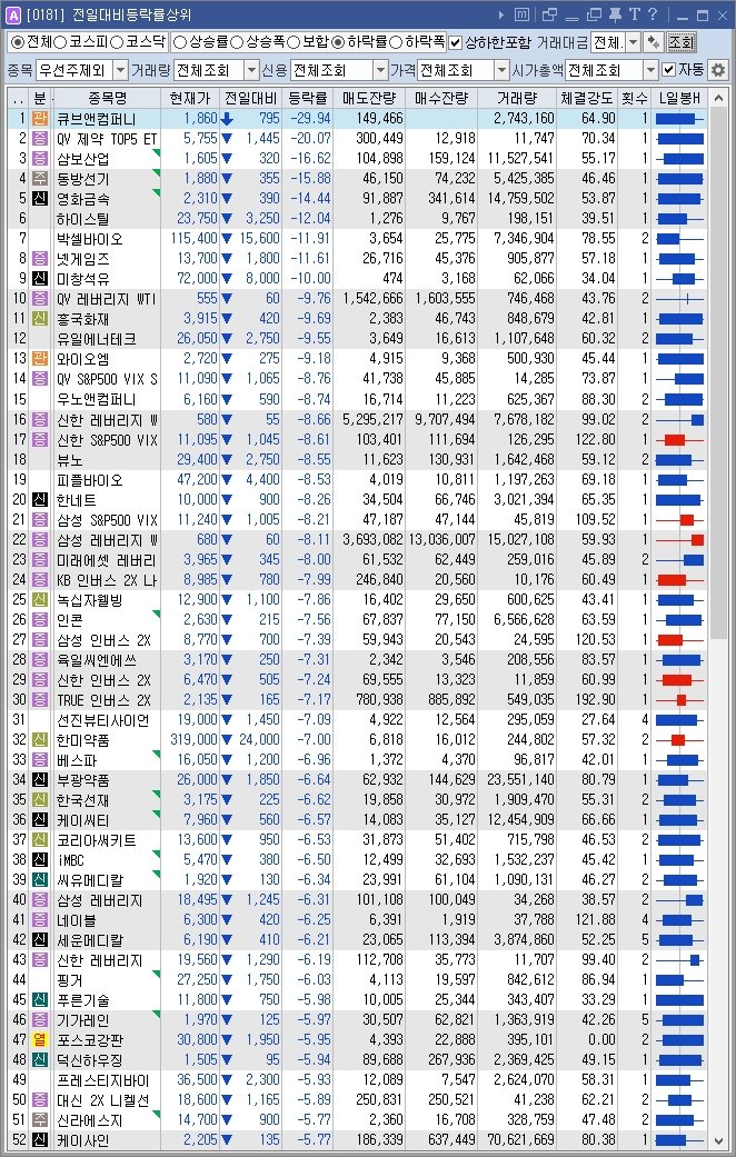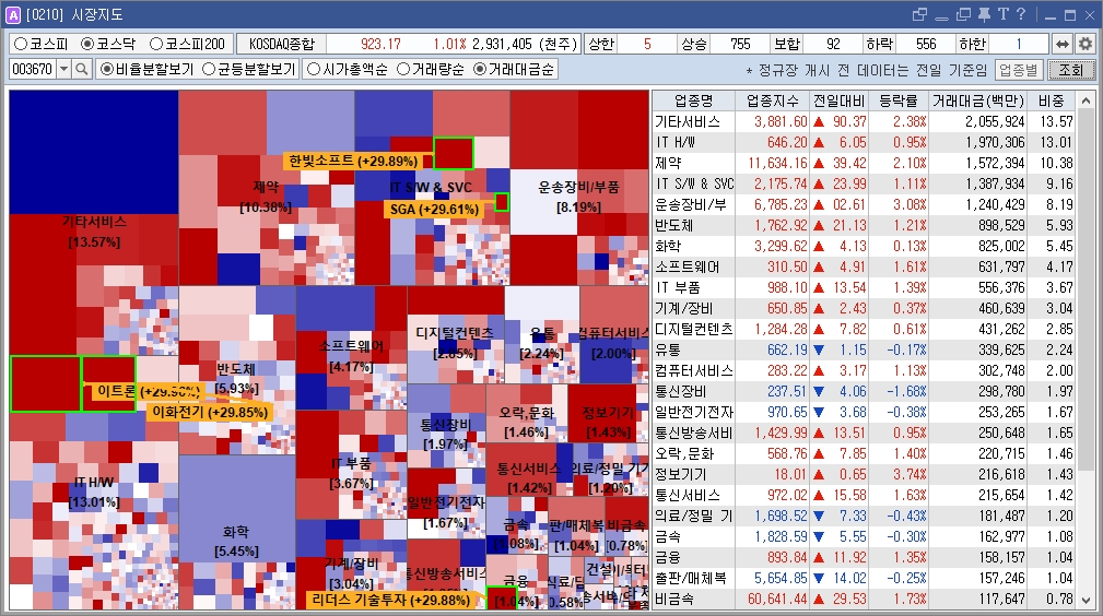 - 화학(-3.68%), 전기전자(+3.63%), 기계(-3.25%) 등 전업종이 약세