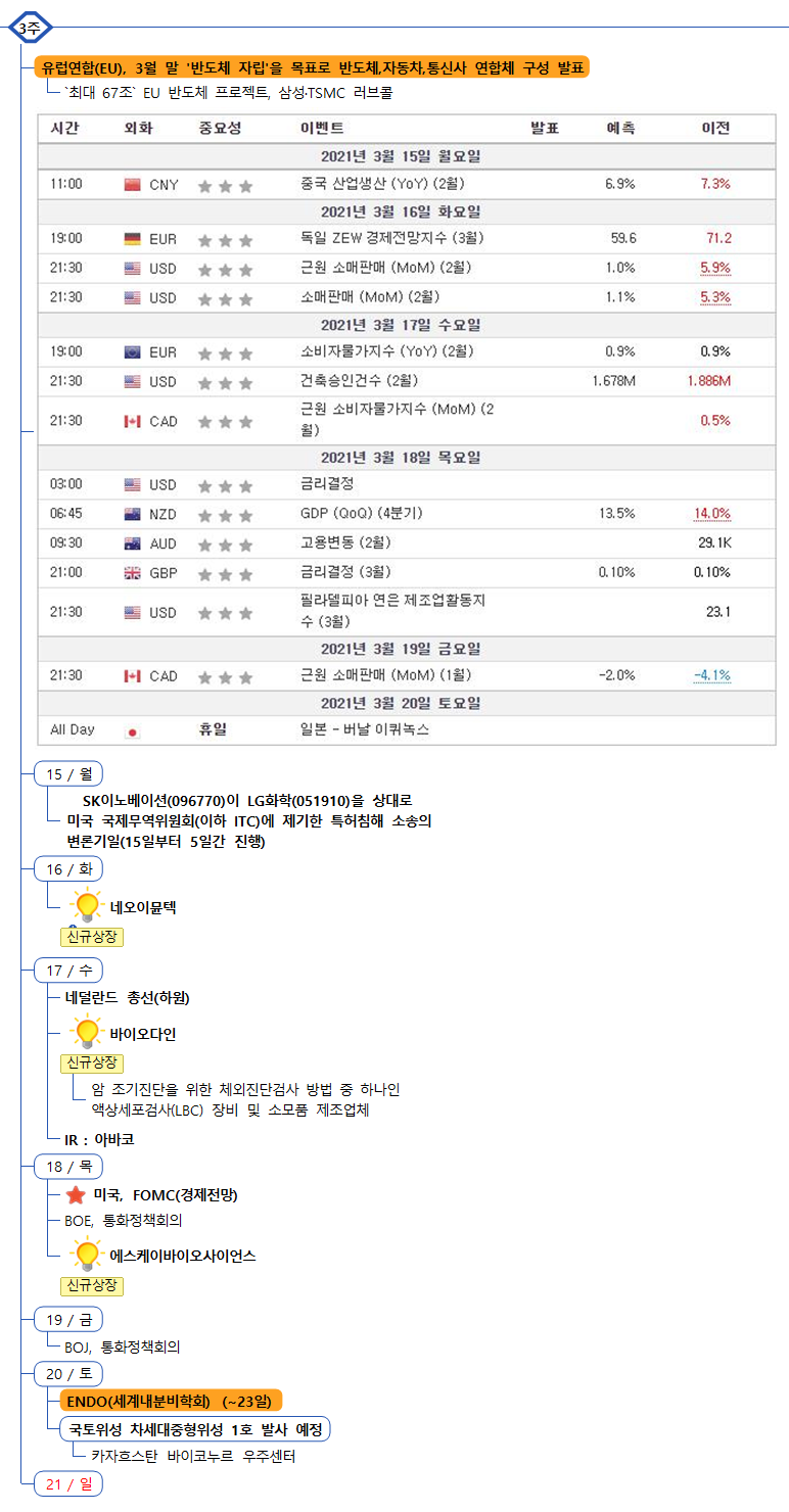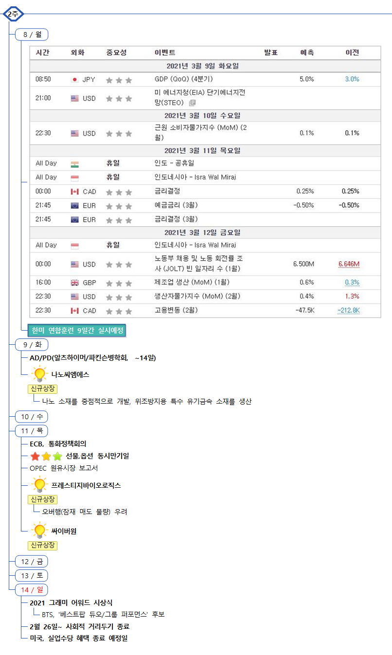 - 장 마감 후 미국 하원에서는 1,400달러 현급 지급, 실업급여 연장, 최저임금 인상(7.5달러->15달러) 등이 포함된 1.9조달러 코로나 추가 부양책을 통과시켰으며, 상원에서는 2주 동안 논의를 거친 후 표결에 들어갈 예정