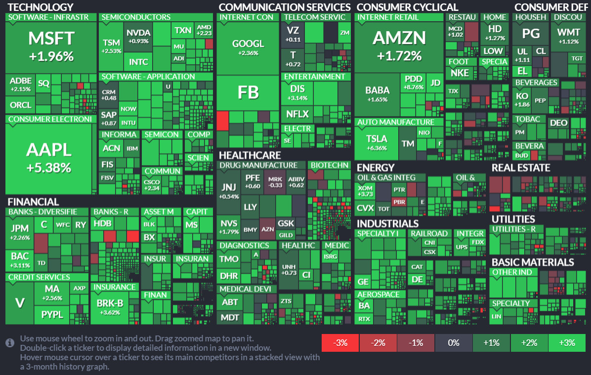 - 다우: +2.0%, S&P500: +2.4%, 나스닥: +3.0%