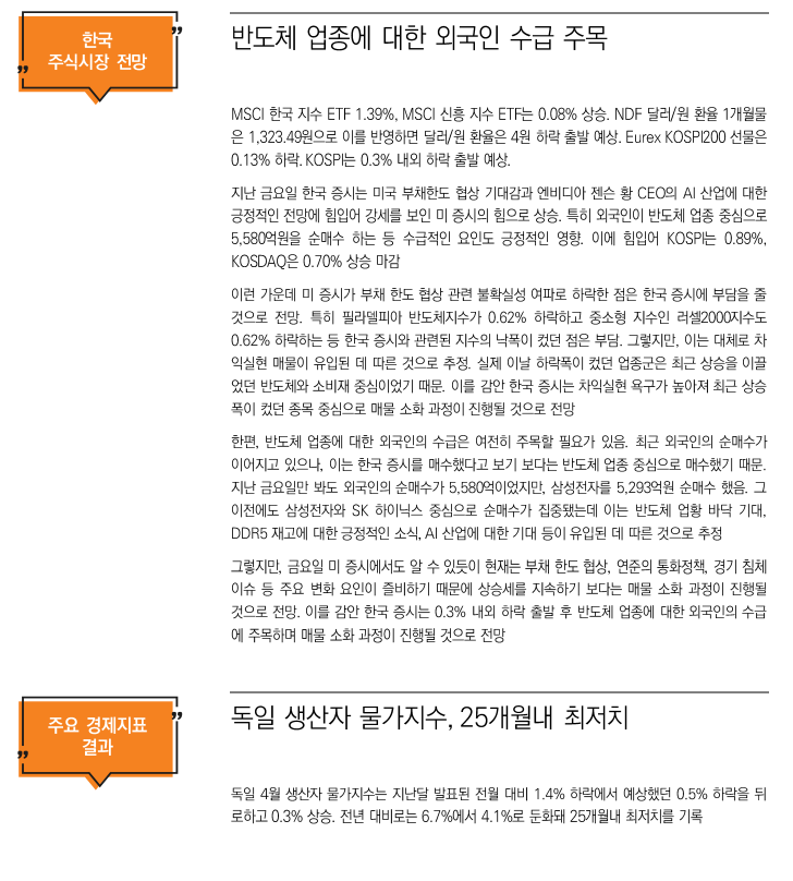 MSCI 한국 지수 ETF 0.48%, MSCI 신흥 지수 ETF는 0.21% 하락. NDF 달러/원 환율 1개월물은 1,329.24원으로 이를 반영하면 달러/원 환율은 2원 상승 출발 예상. Eurex KOSPI200 선물은 0.09% 상승. KOSPI는 보합 출발 예상.